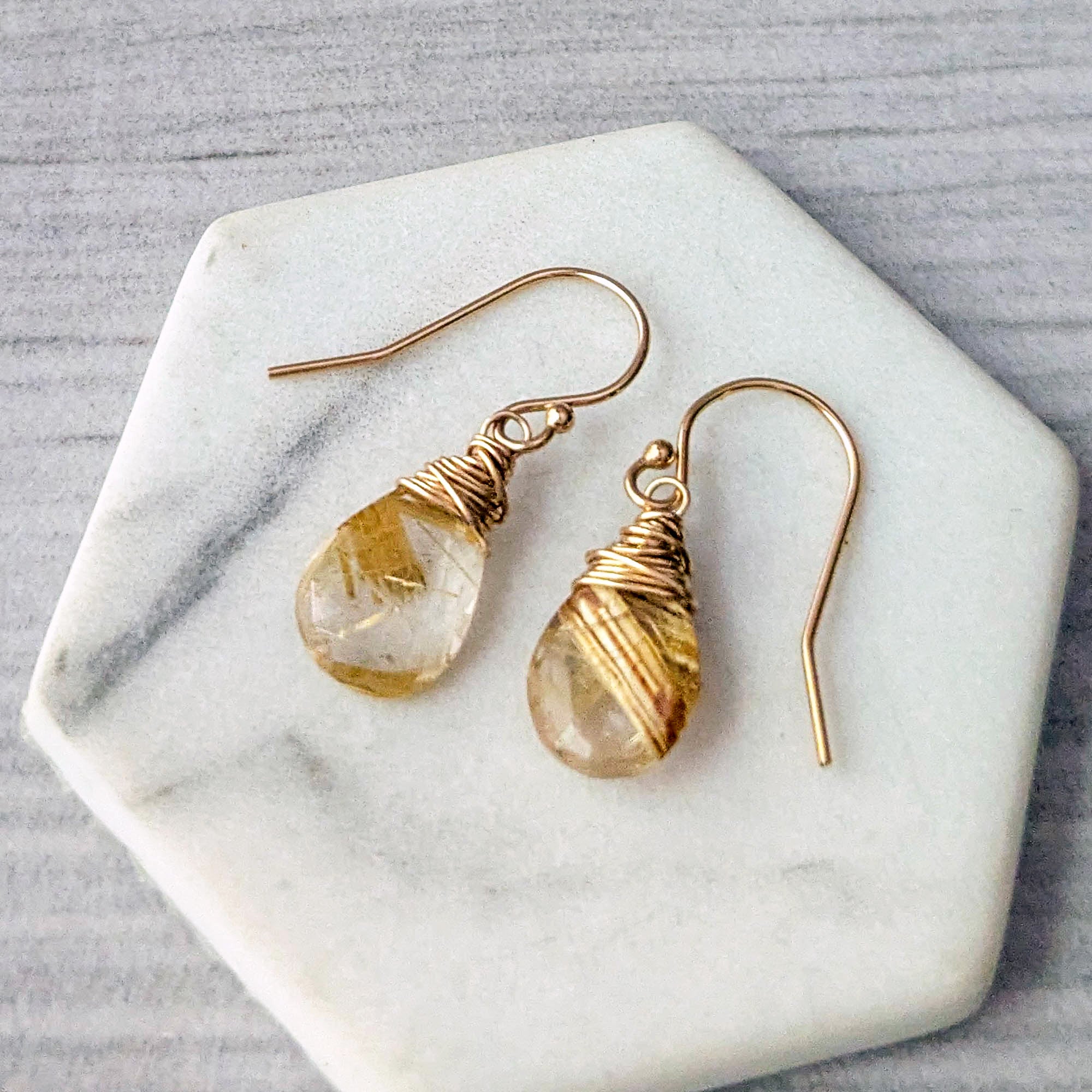 The stunning drops featured in these earrings are an exceptional example of golden rutilated quartz. I've never seen golden rutilated quartz with such defined needles. The shape and faceting of the stones further enhance the bold inner veining of them. I've intricately wrapped these gemstone in 14k gold filled wire to play with the textural complexity of the golden rutile.