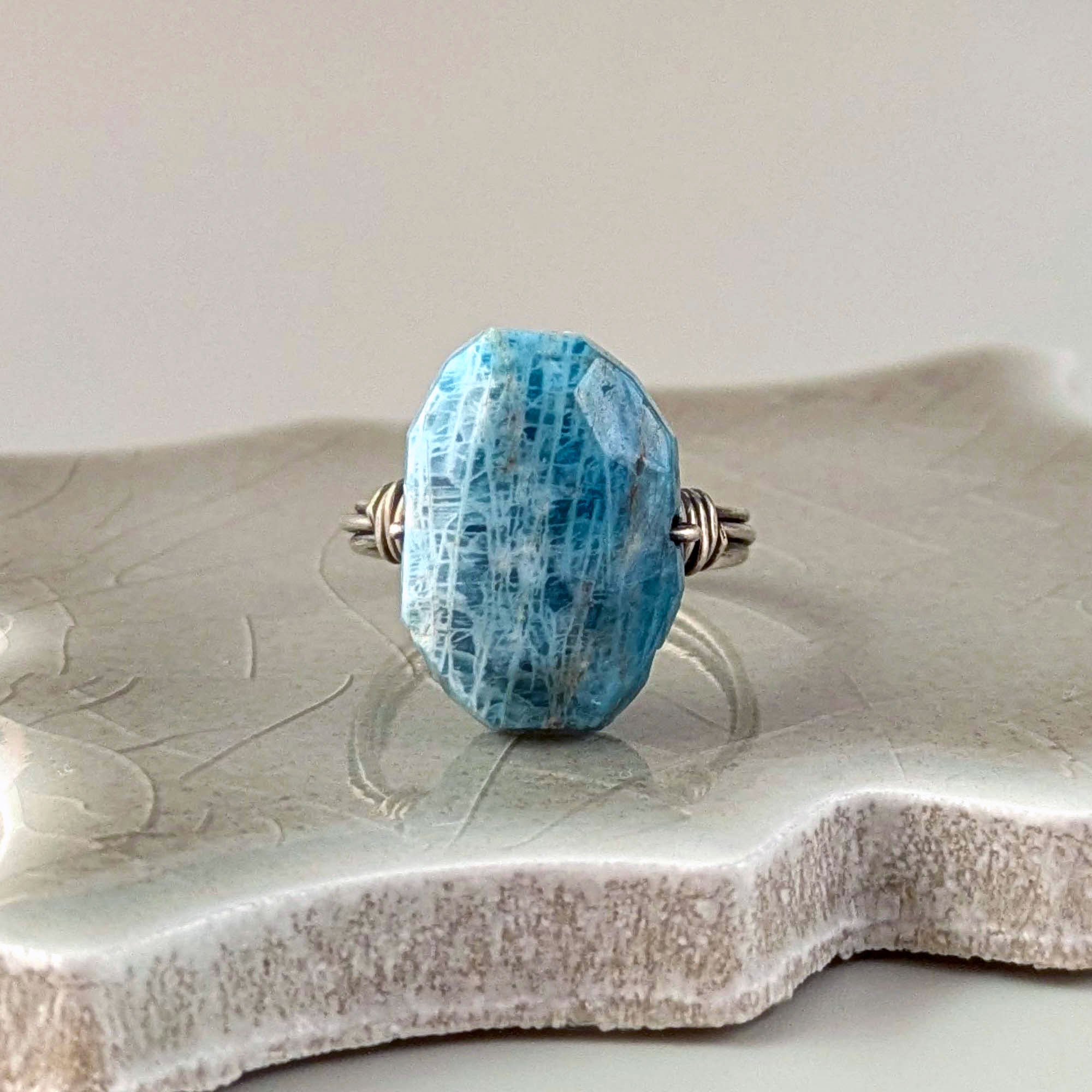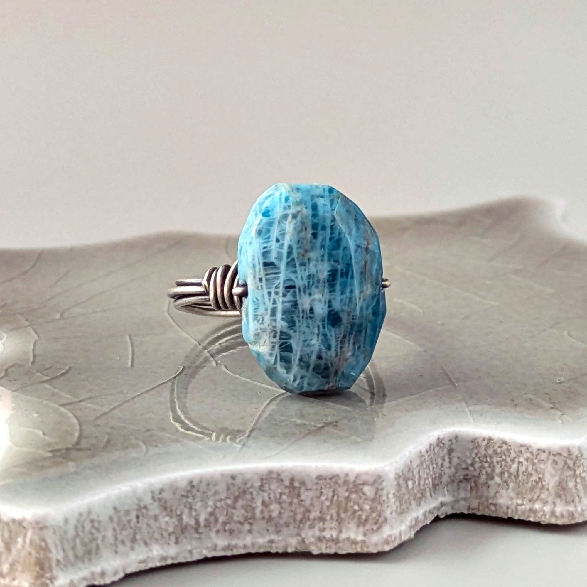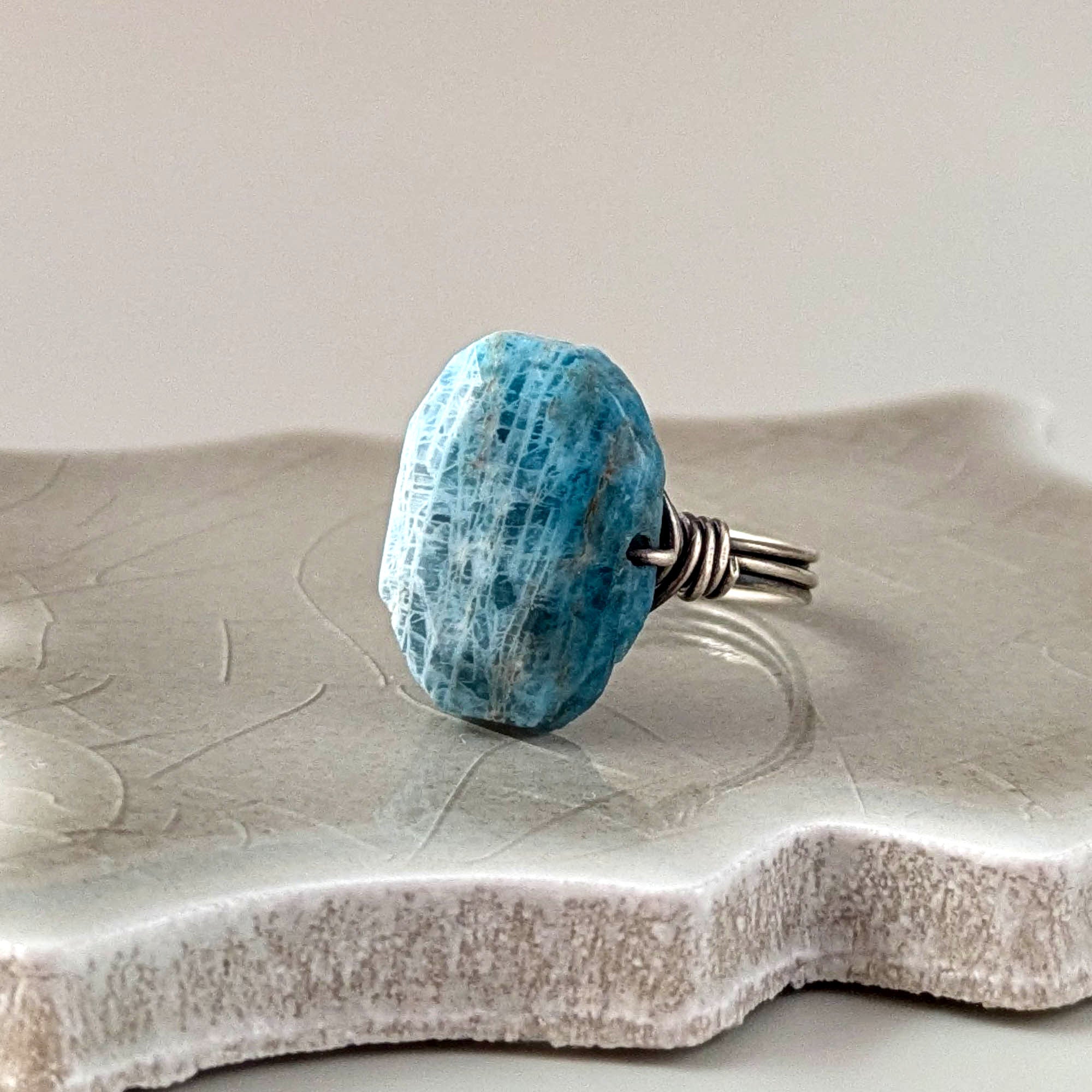 This large apatite nugget makes a great unorthodox statement ring. Apatite is a stone that is closely associated with the throat chakra so it can serve as a strong reminder to always express your truth. Available in half or whole sizes in bright or oxidized sterling silver or yellow or rose gold filled wire, stones vary in size, color, and pattern (see photos).