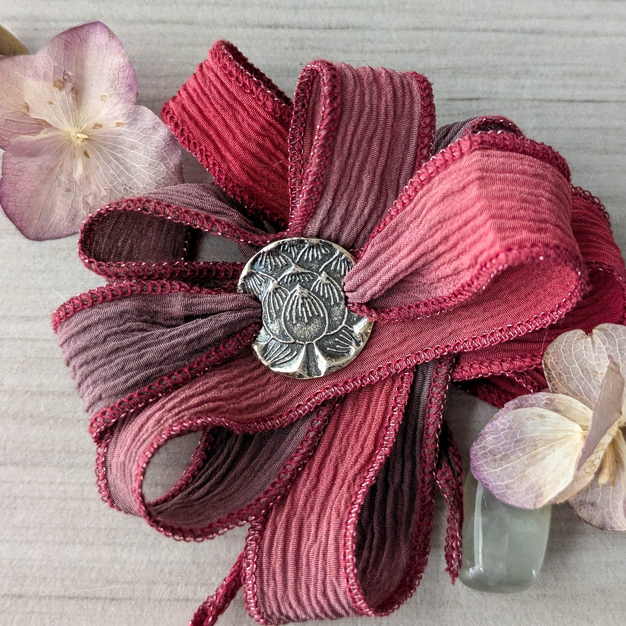 I've threaded silver lotus centerpiece onto beautiful hand dyed silk ribbon in romantic shades of dusky lavender and deep violet but I offer many colors of ribbon. Please see the last two photos and make your selection from the drop down menu.