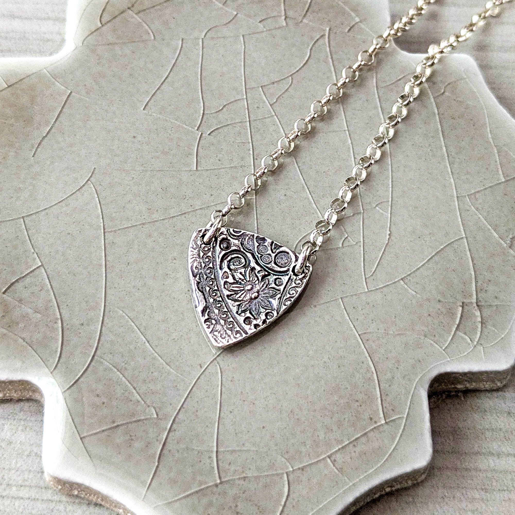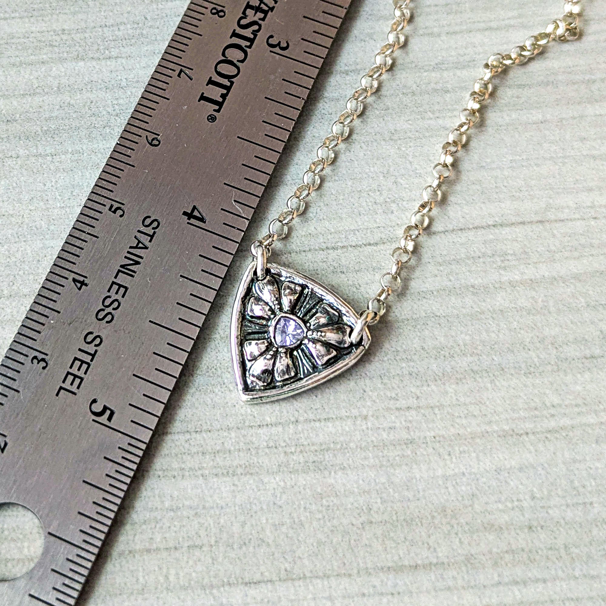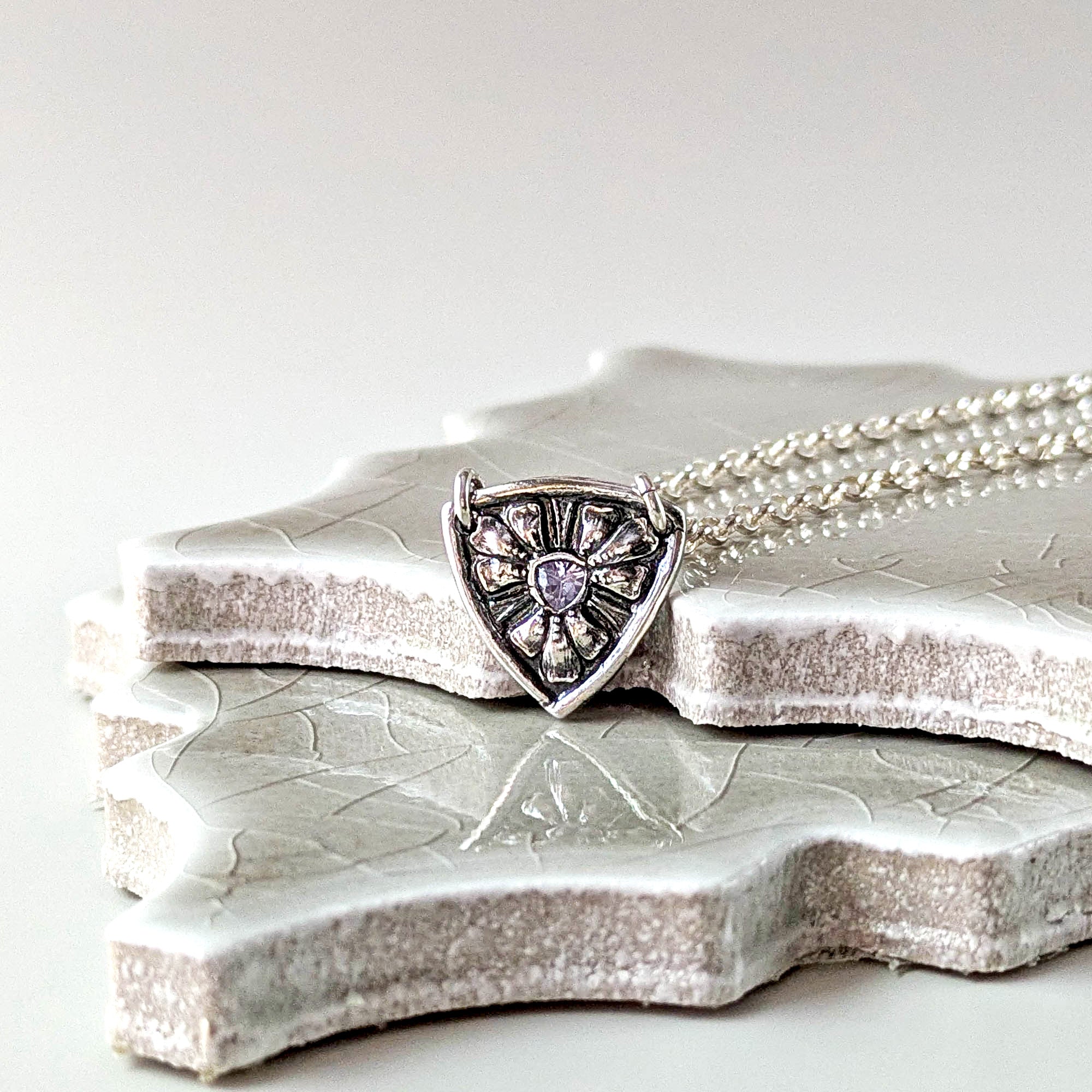 I cast this regally beautiful necklace in fine silver from a portion of an antique button. The gracefully curving triangular shape is evocative of shields from a heraldry gone by. Elegant plumes radiate from each corner of a light blue faceted tanzanite trillion. The reverse side features a dainty floral paisley pattern.