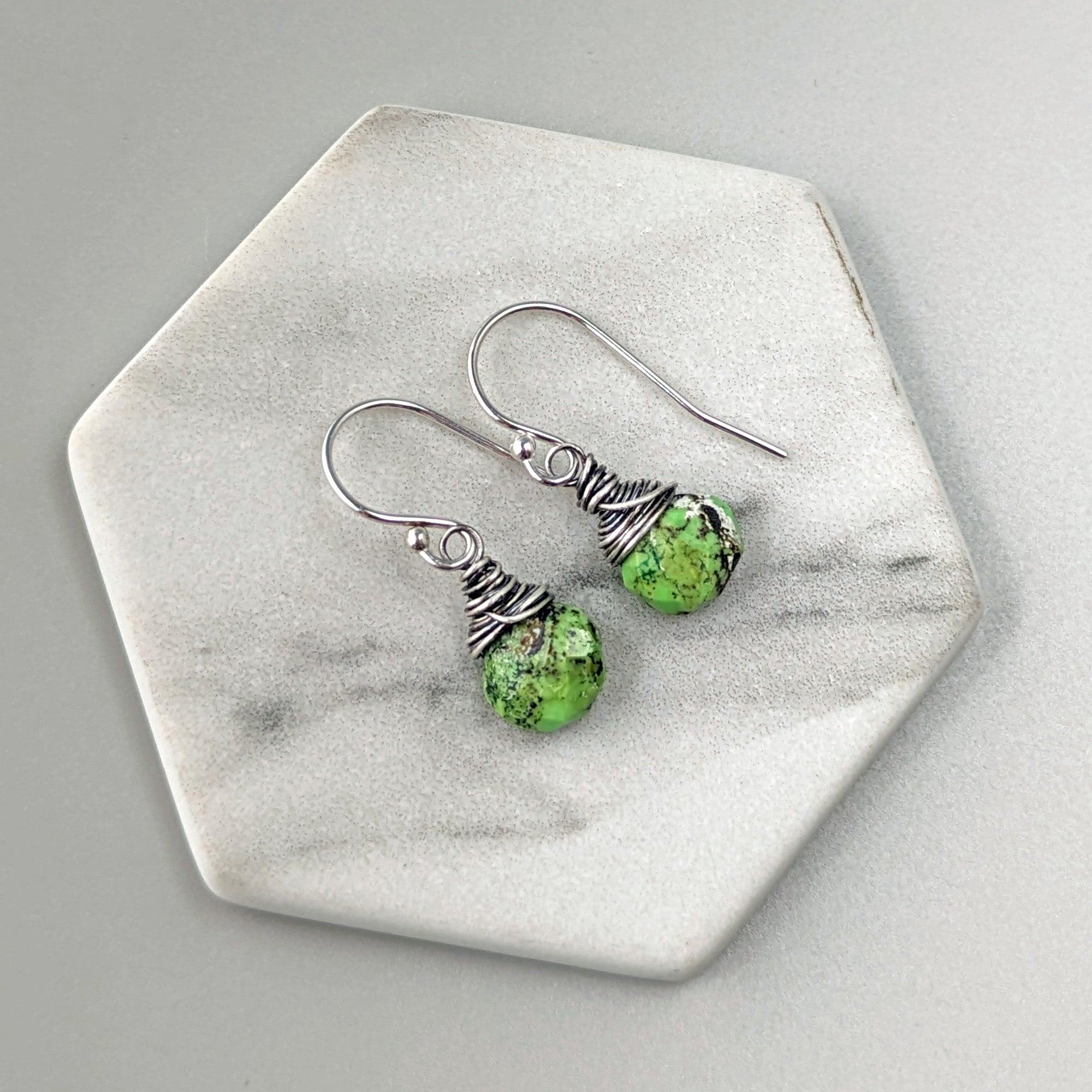 I have wrapped these precious stones carefully with oxidized sterling silver wire and added my simple yet nicely detailed sterling silver earwires. These earrings measure 7/8" long by just over 1/4" wide. Sterling Silver lever back earwires may be substituted for the ear hooks, make your selection from the drop down menu.