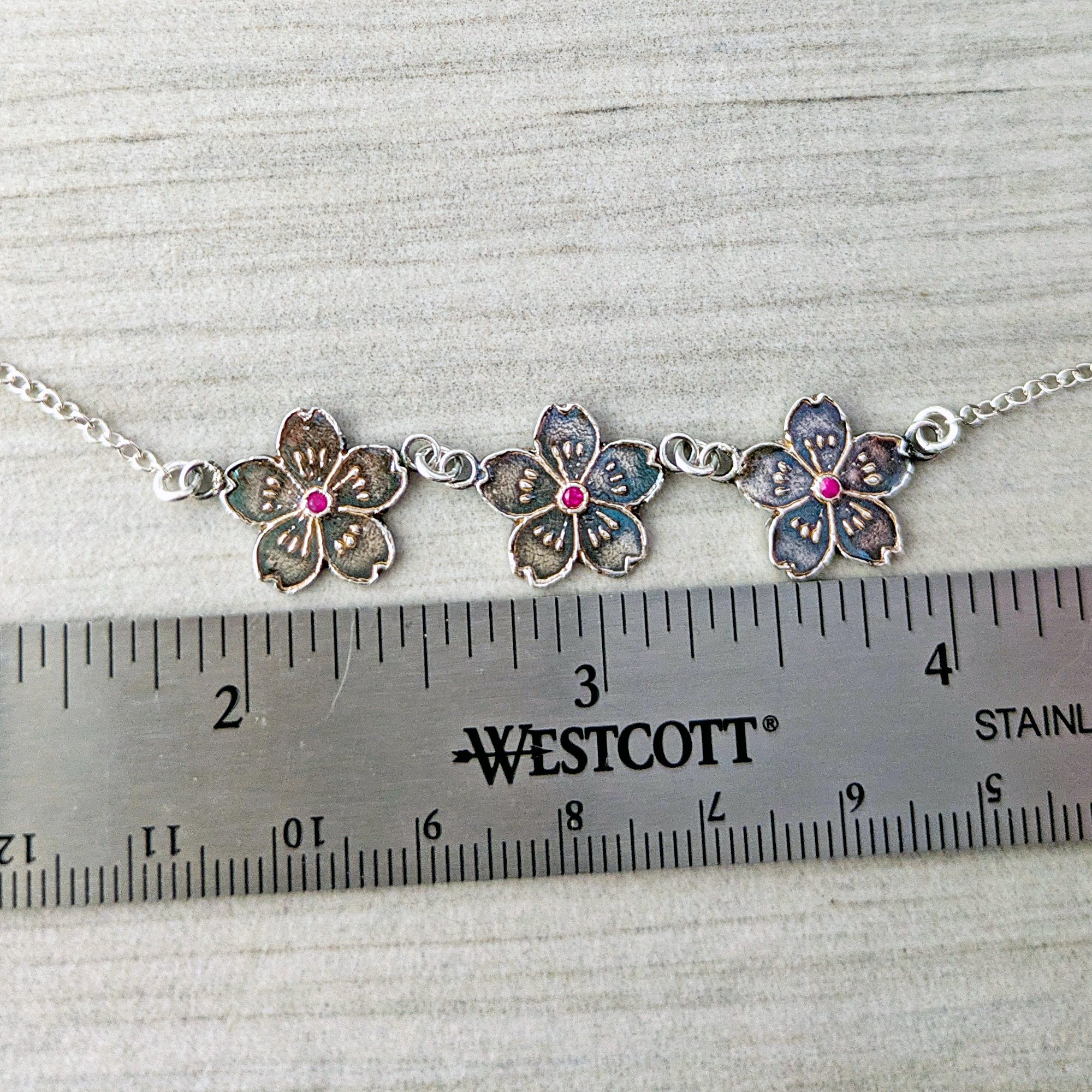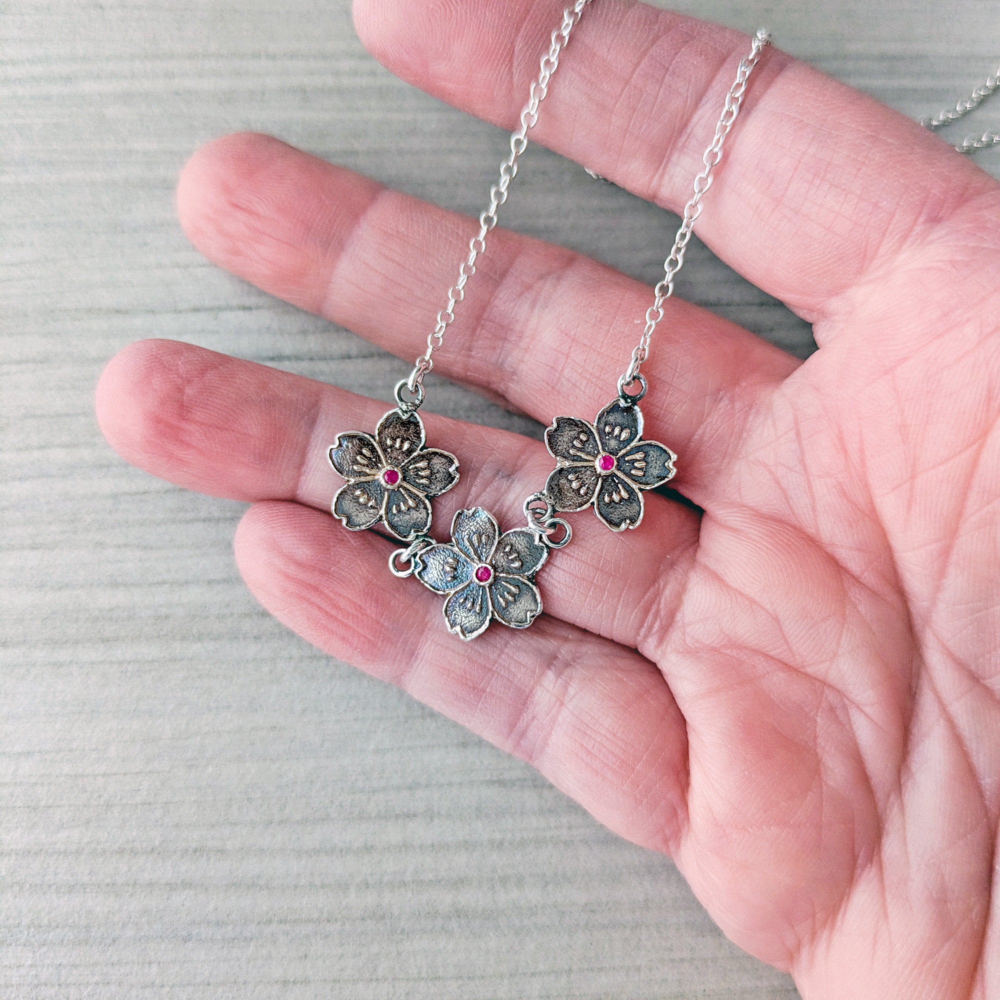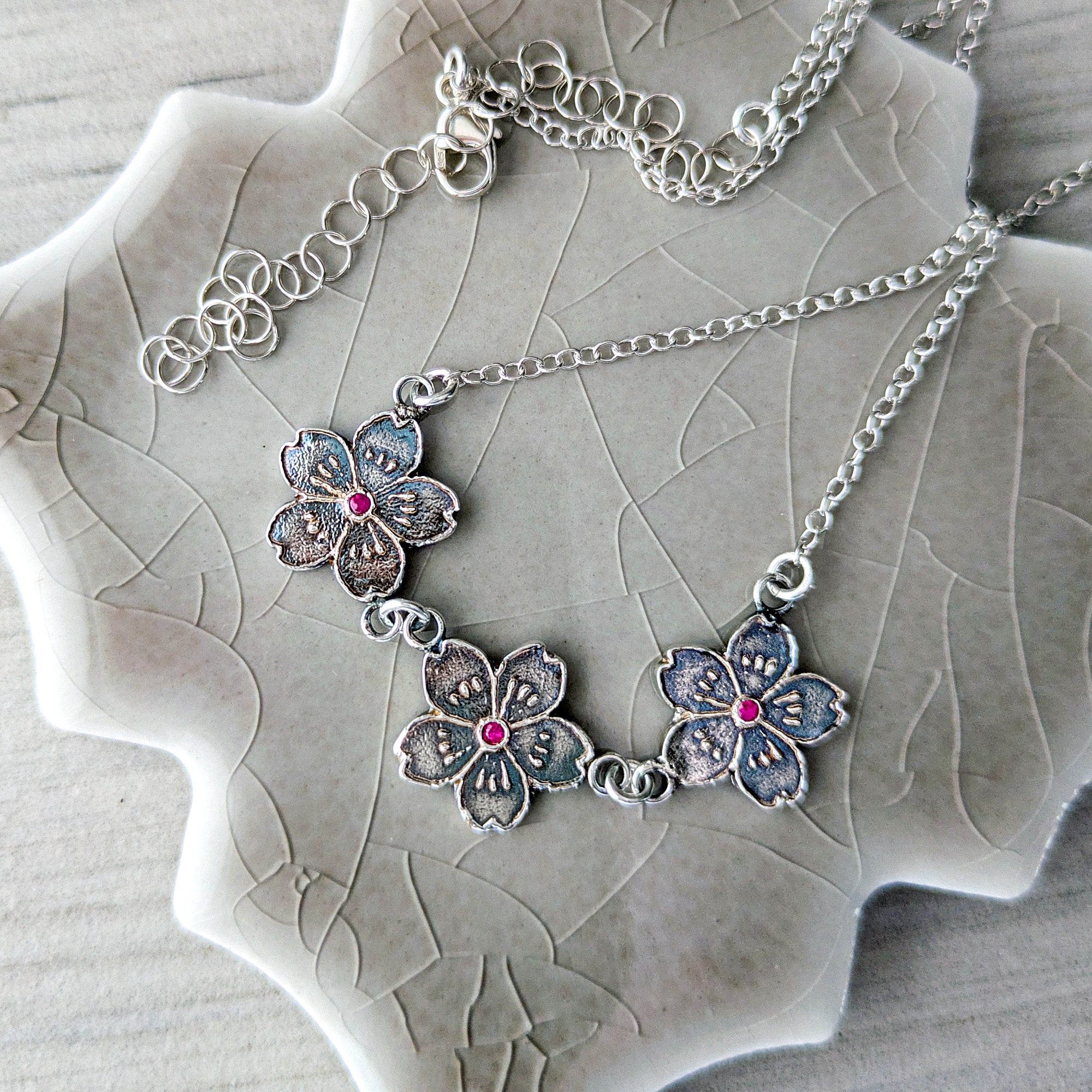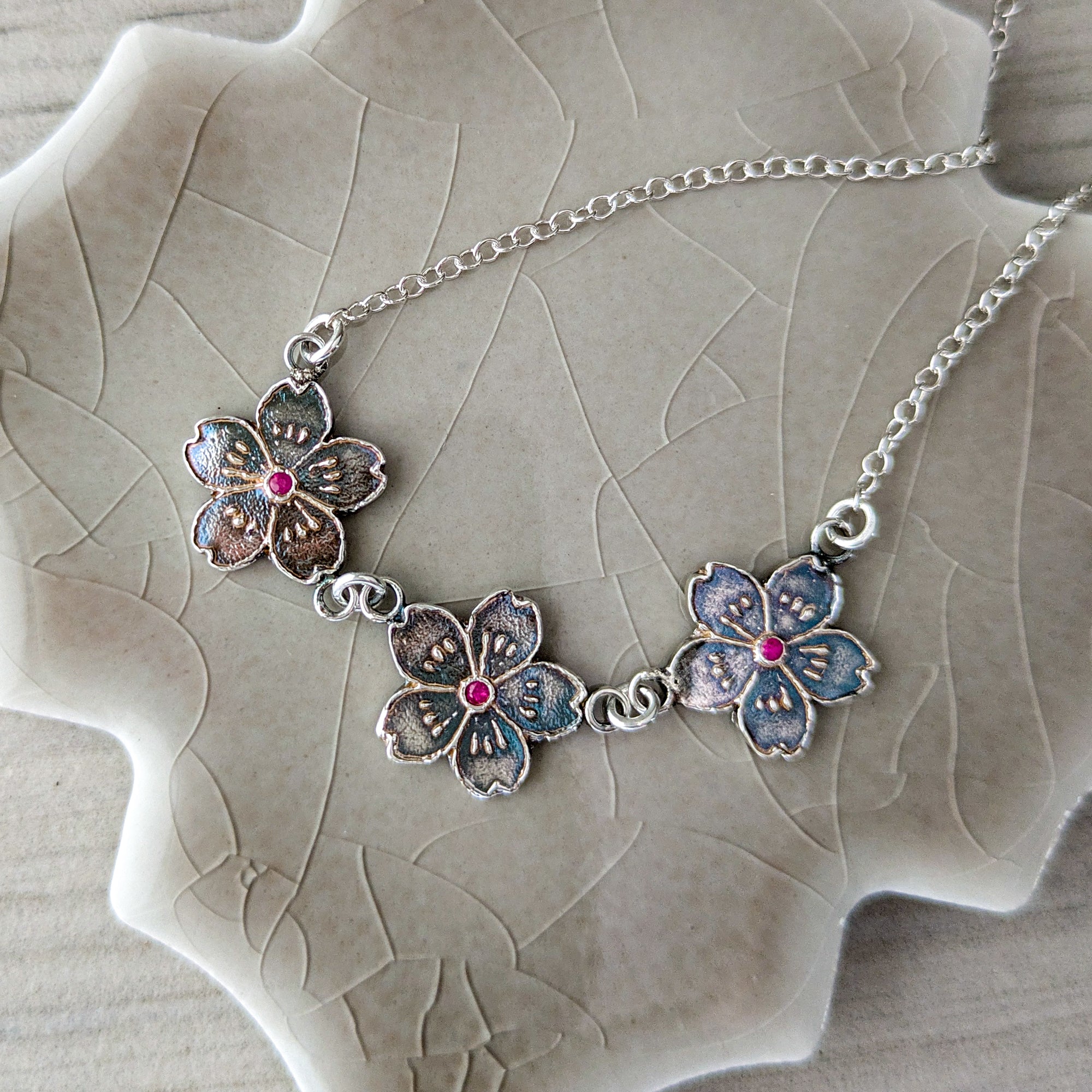 Each flower is sculpted in fine silver and centered with a tiny ruby, creating a gentle sparkle of color within the delicate floral design. The blossoms are linked together in a graceful festoon that follows the natural curve of the collarbone.