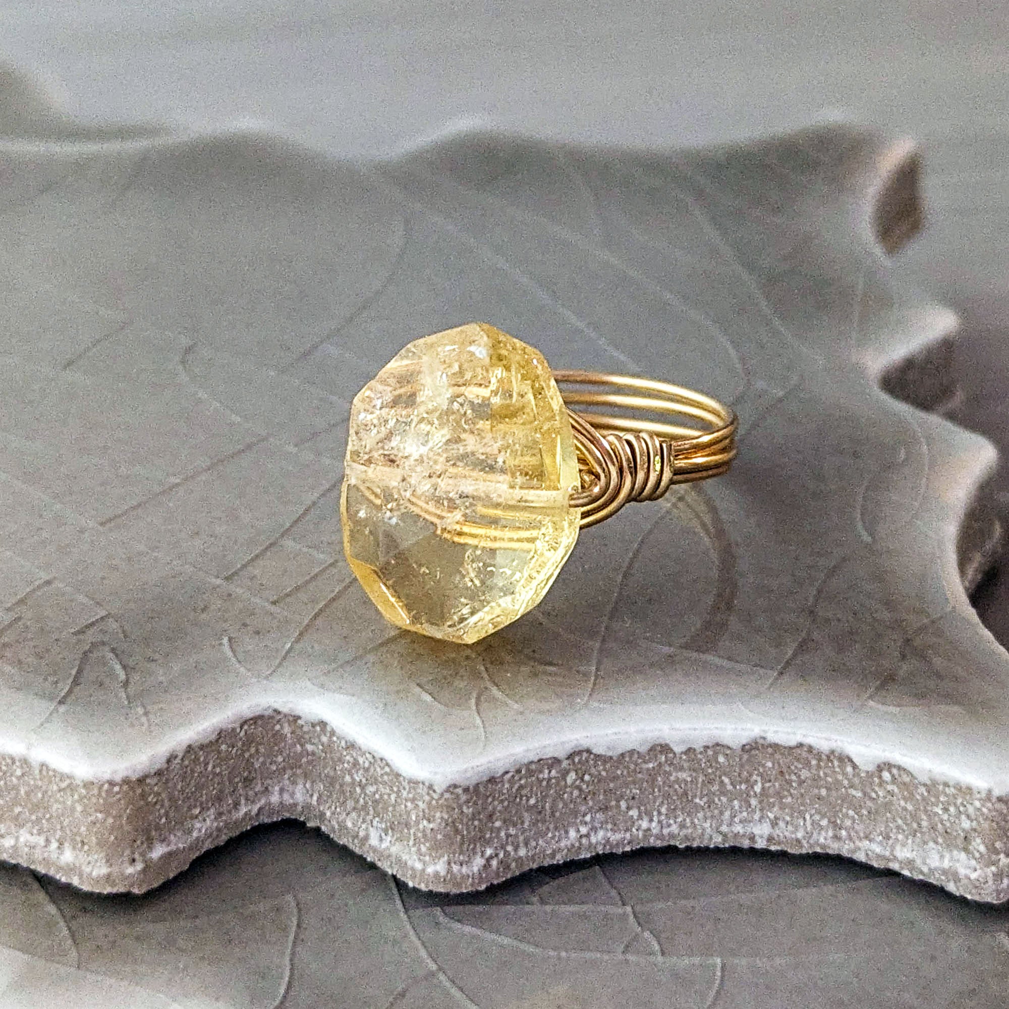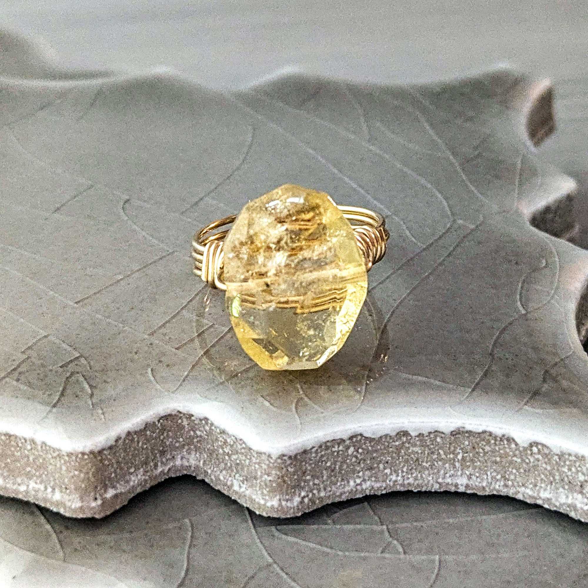 Citrine, a wonderfully sunny gem, is known as "the stone of happiness", as well as "the merchants stone". It is the stone associated with the solar plexus chakra, the center of one's personal power, motivation and sense of purpose so it can serve as a visual reminder to seek your joy. Your ring will be made to order in half or whole sizes in sterling silver or 14k gold fill, stones vary in size, color, and pattern (see photos). Citrine is also one of the traditional birthstones for November.