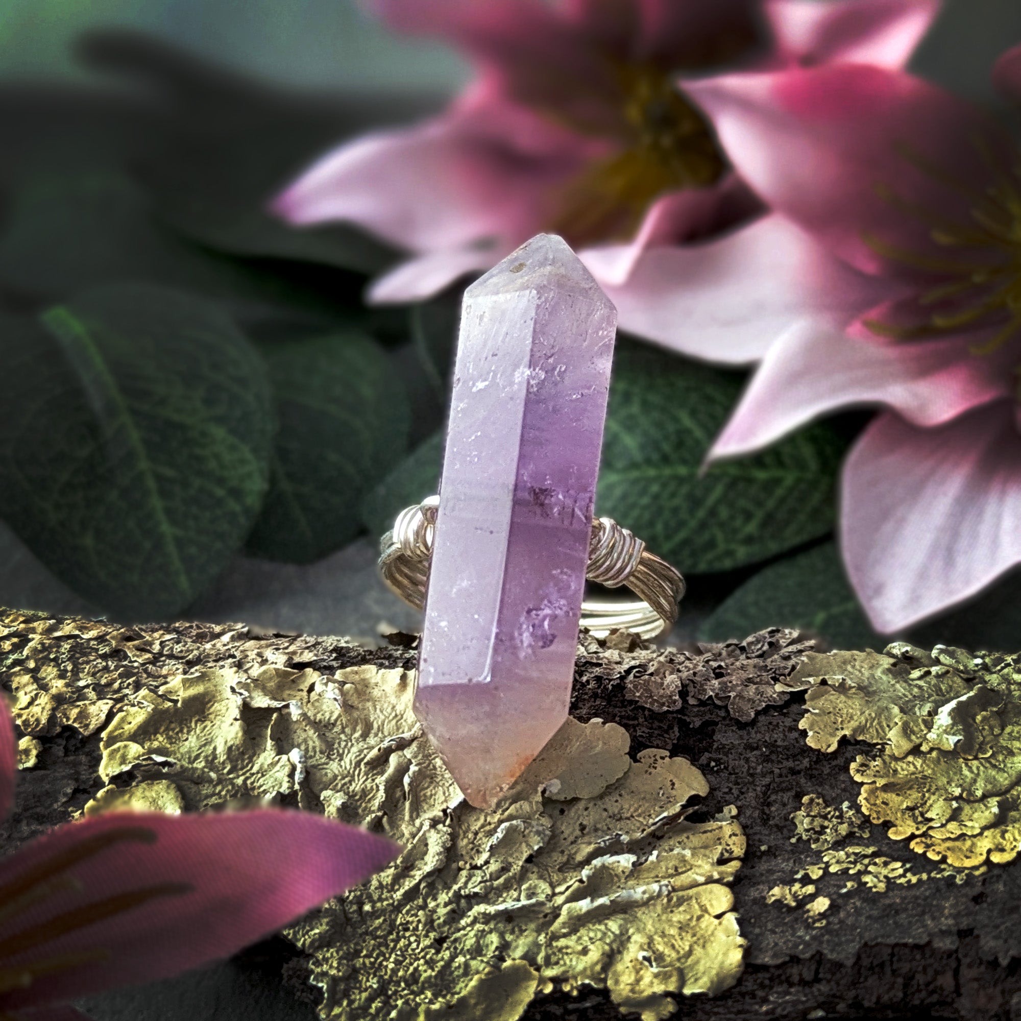 Amethyst, is the stone of the crown chakra, it is called the "Tranquility Stone" and can be worn as a talisman to remind yourself that although things outside of ourselves may be chaotic and unpredictable we have resources of inner wisdom and calm. Amethyst is also the February birthstone. Your ring will be made to order in half or whole sizes in sterling silver or 14k gold fill (twisted as pictured or non twisted), stones vary in size, color, and pattern (see photos)
