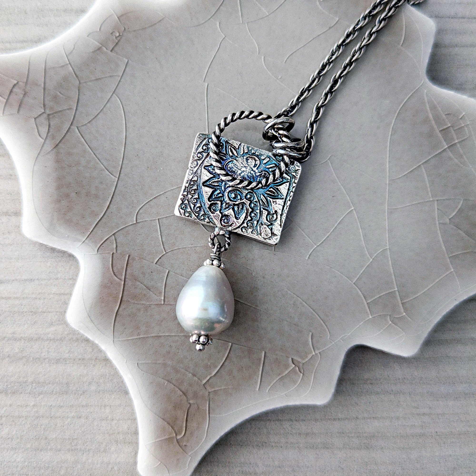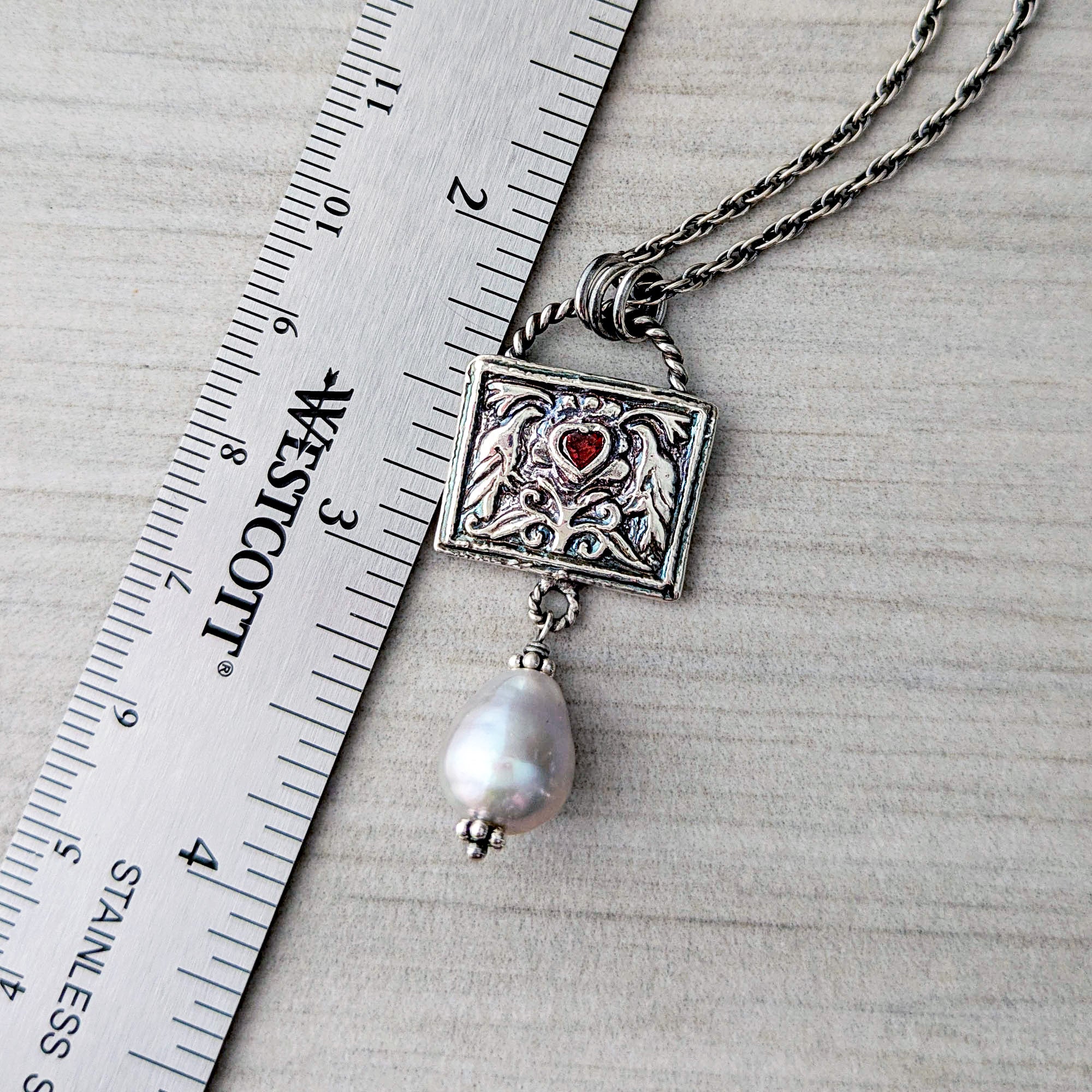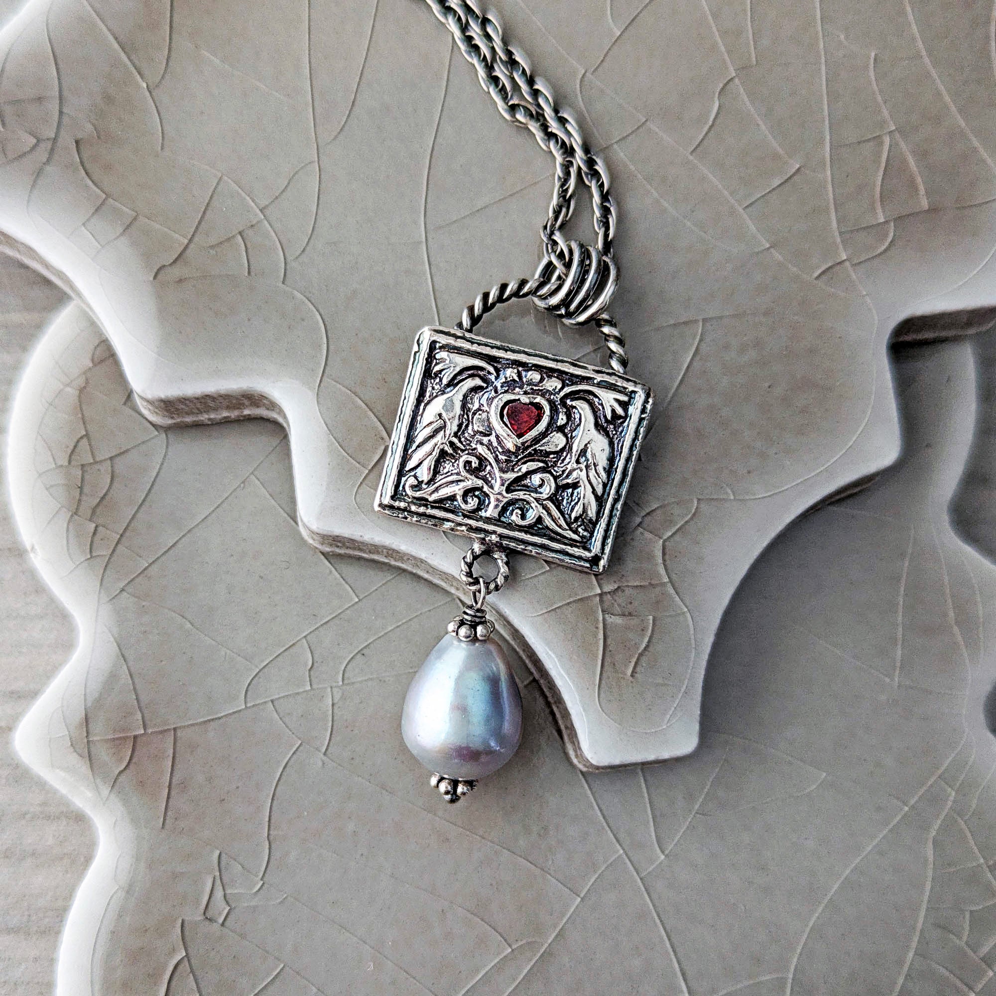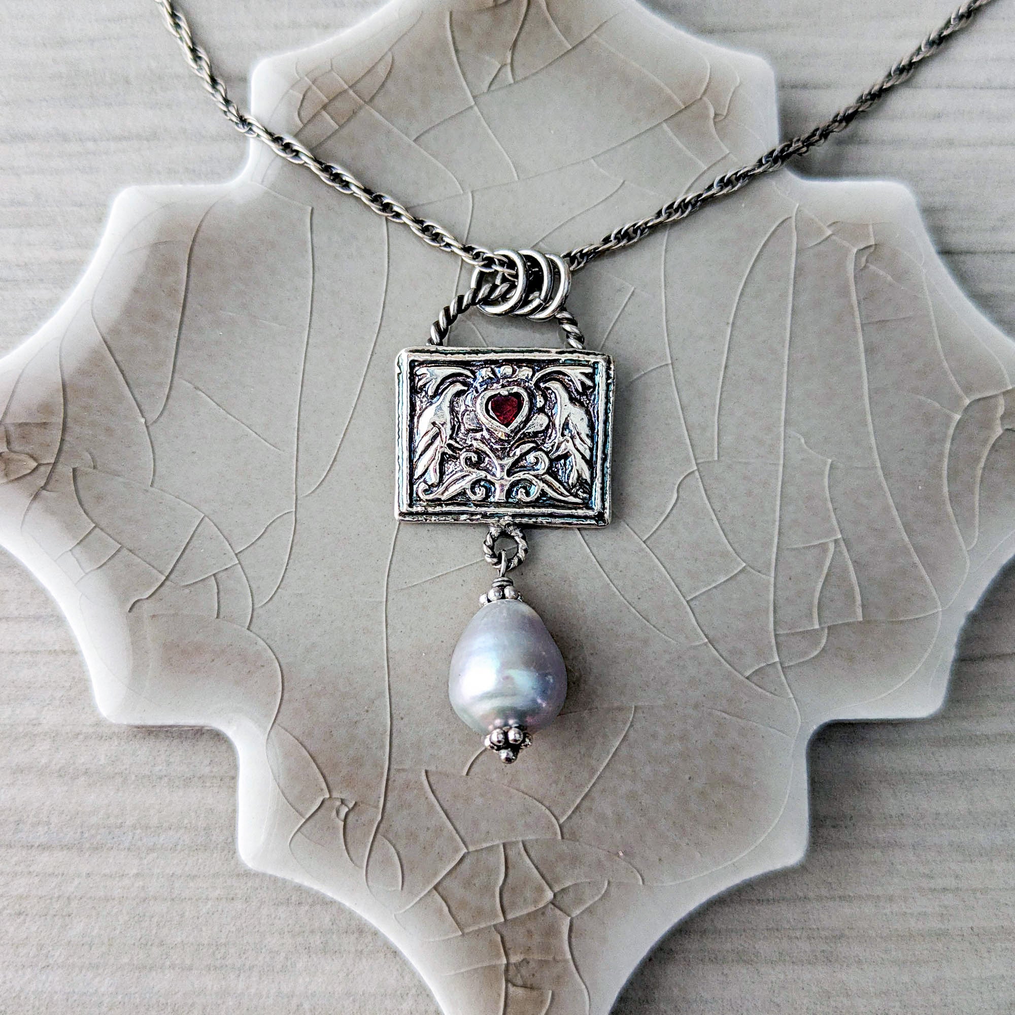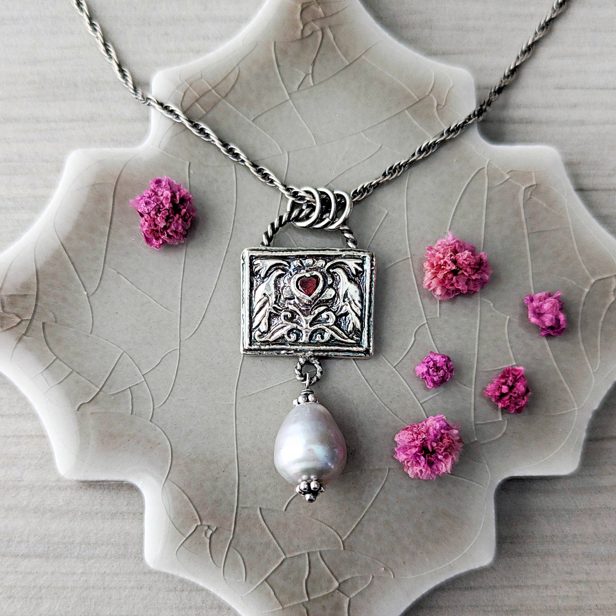 Cast in fine silver from an antique tribal jewelry die, two birds flank a blooming central motif. Nestled between them rests a deep garnet heart — rich, wine-dark, and luminous. Below, a silvery freshwater pearl softens the structure with its gentle glow and movement.