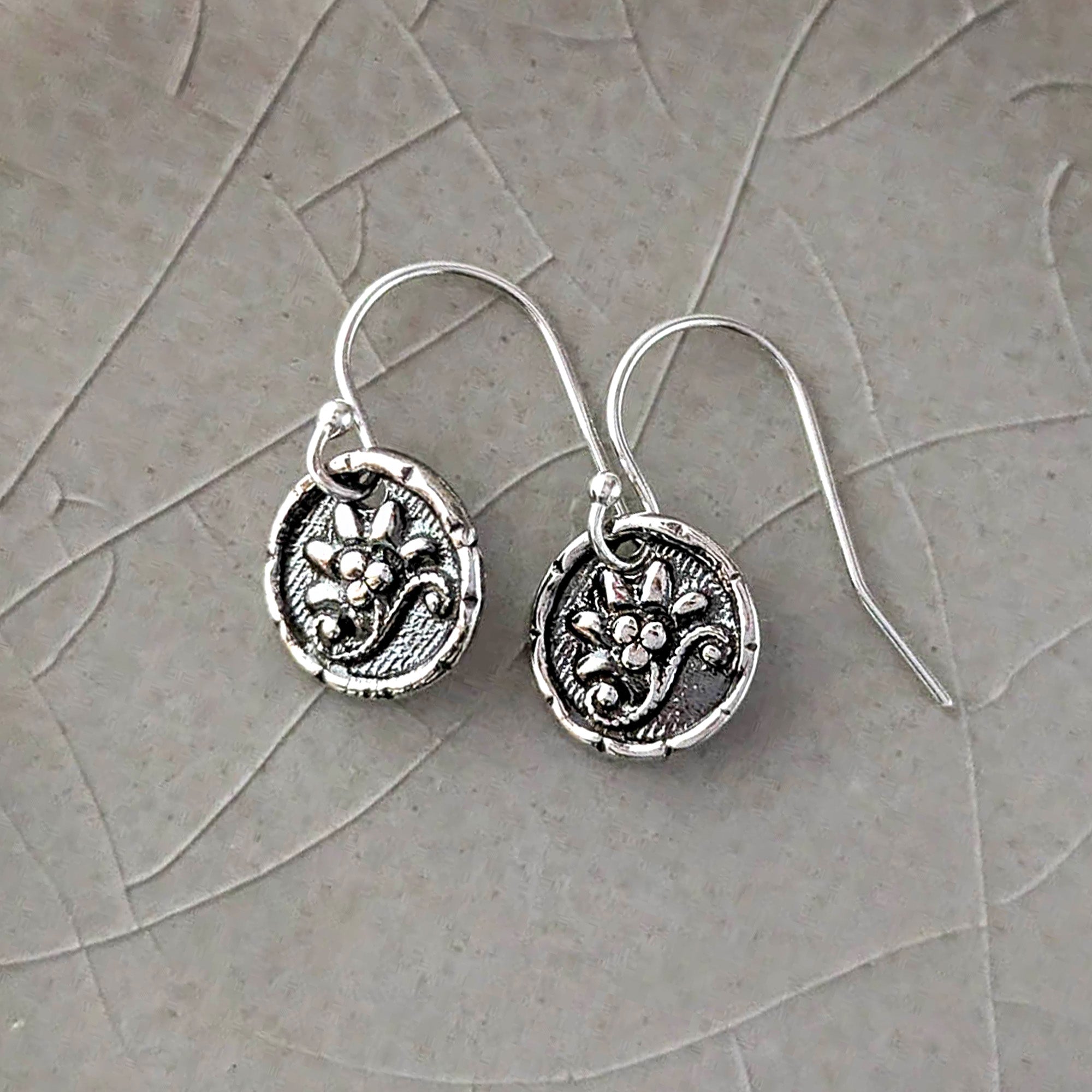 I cast these beautifully detailed dainty little earrings in sterling silver precious metal clay from a mold I made of an Antique Victorian era button from my vast collection. It has given me so much joy to curate my collection over the last two decades, haunting many antique shops and flea markets in places far flung and near me. I often refer to the design of this earring as the "Victorian Scroll Flower" as it depicts a stylized blossom over a graceful flourish.