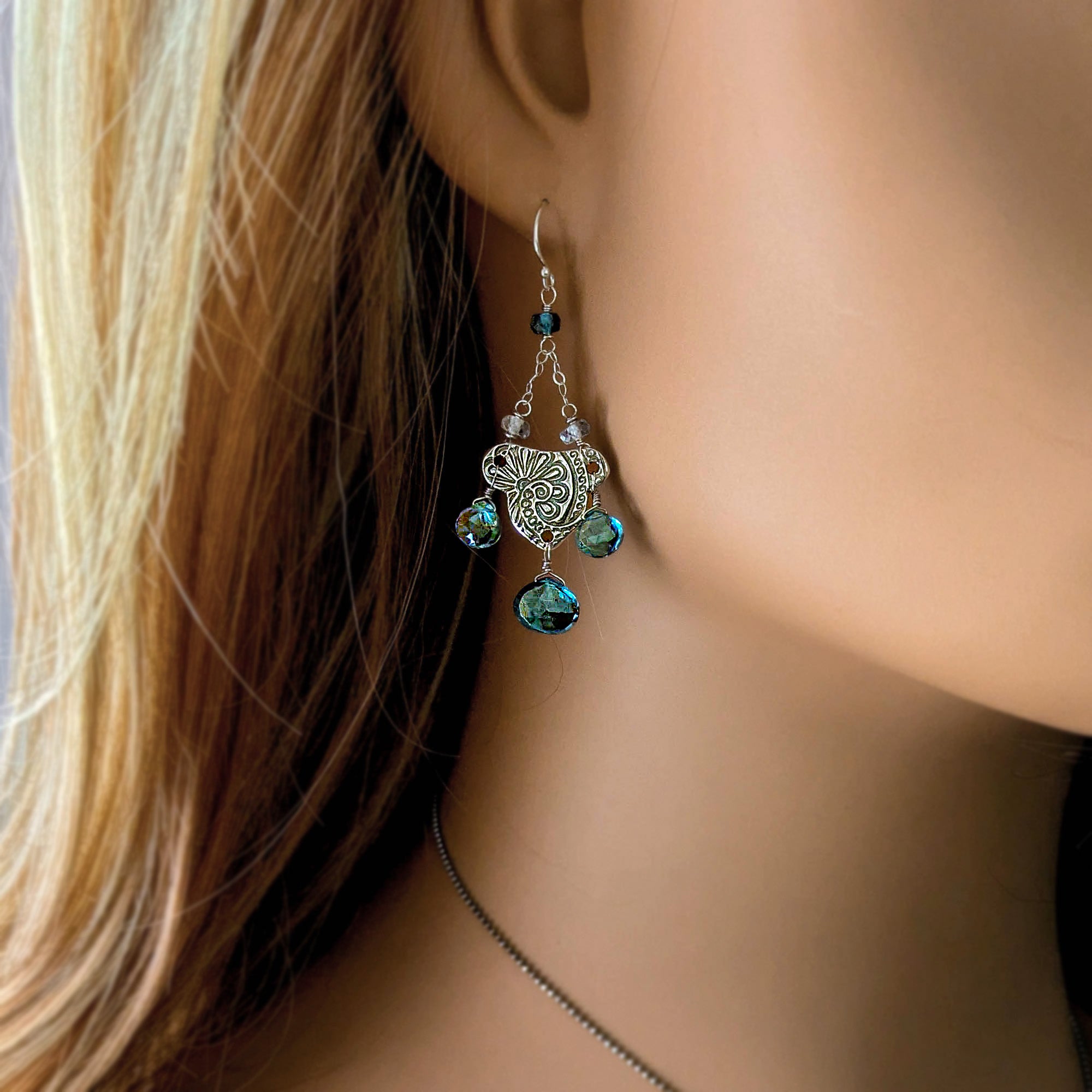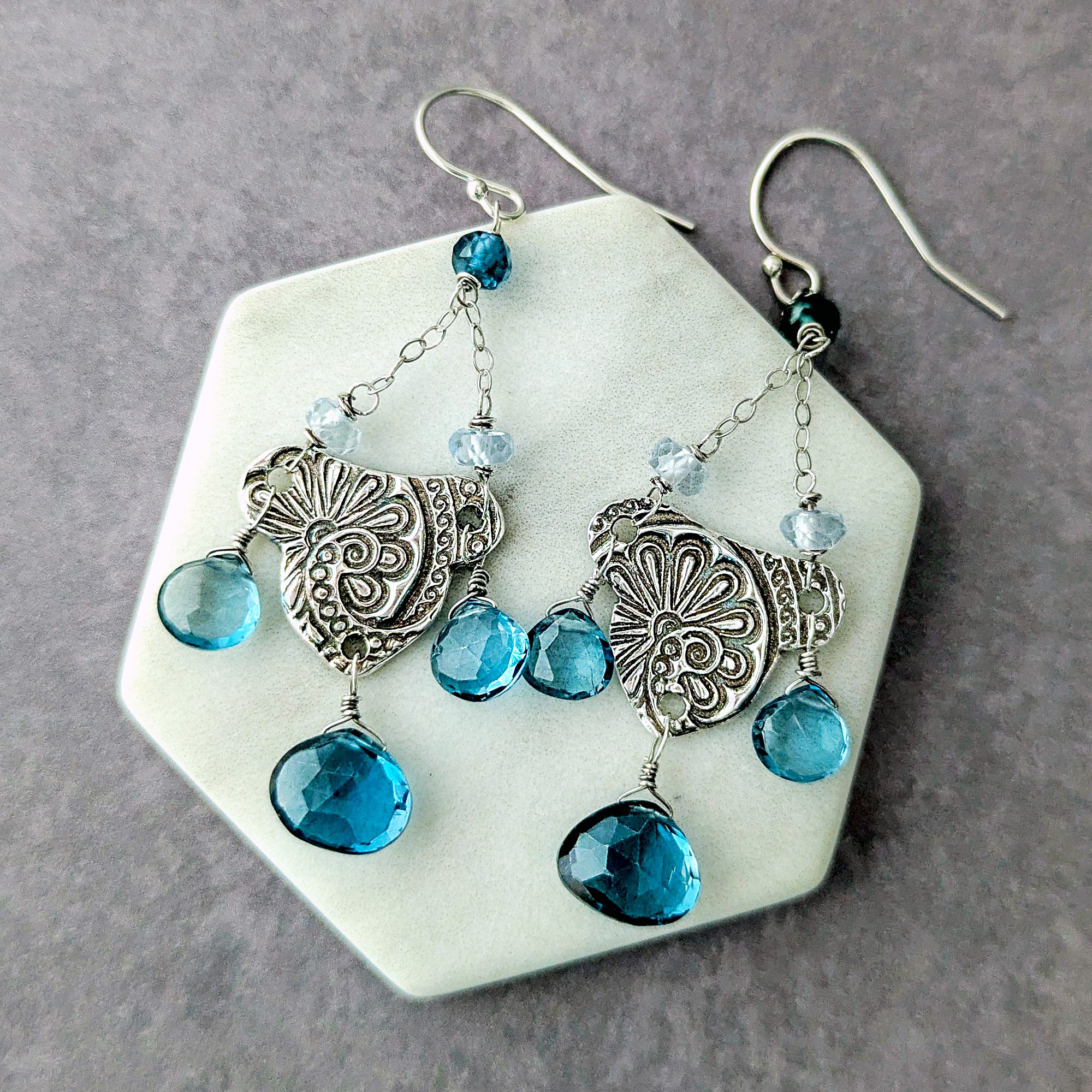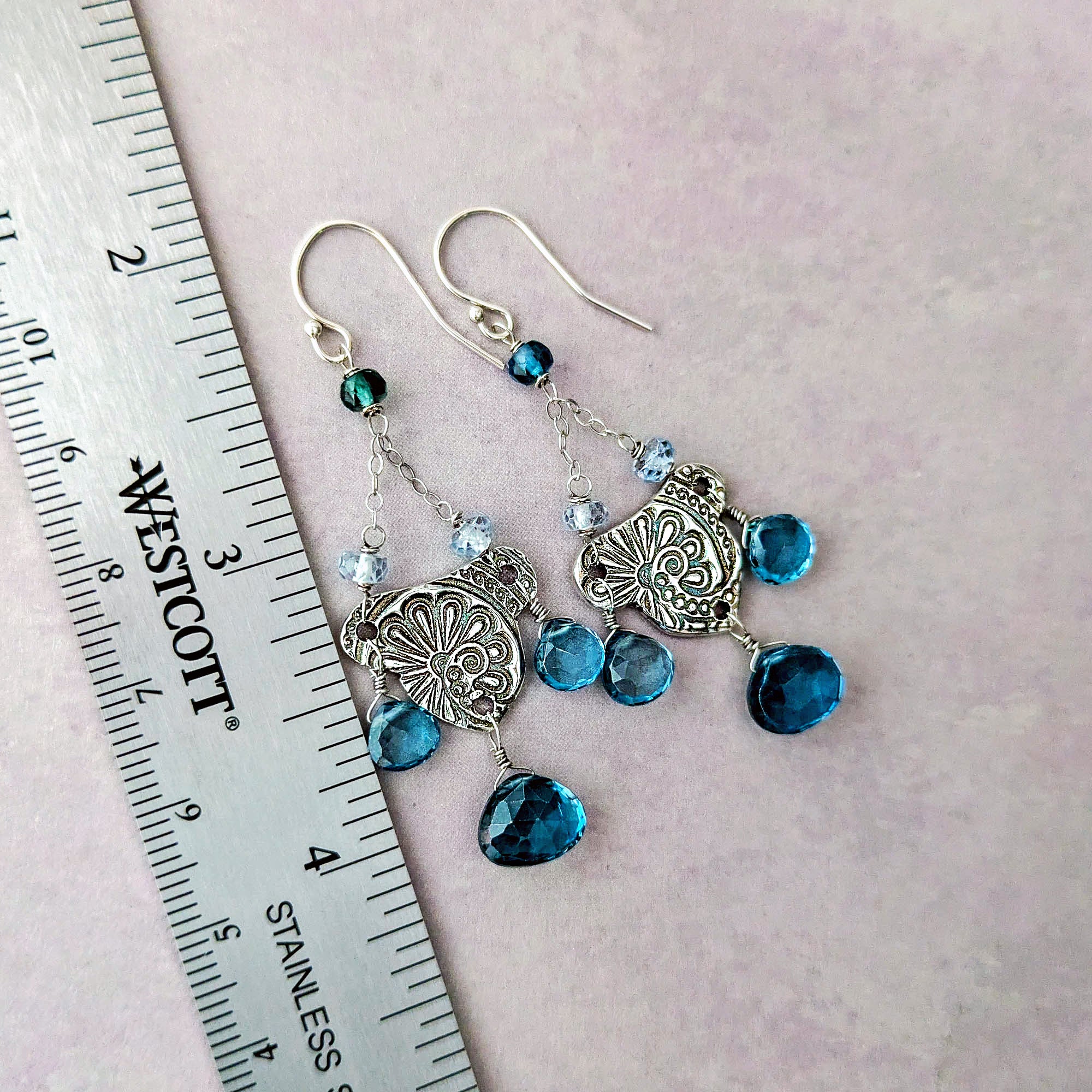 A dance of deep blue light and intricate silverwork — these London Blue Topaz earrings capture the essence of timeless elegance and quiet power. Each sterling silver component is embossed with a filigree lace motif and oxidized to reveal its luminous relief, then adorned with faceted topaz briolettes that catch the light with every movement.