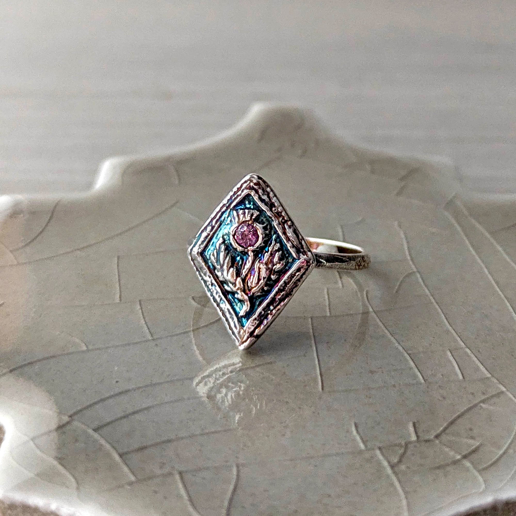A symbol of resilience, protection, and enchantment, the thistle takes center stage in this exquisite ring. Cast in fine silver from an antique button, the thistle motif is framed in a vintage-inspired diamond-shaped bezel, evoking timeless elegance with a mystical edge. Details are added by hand so as to insure that no two rings are completely alike.