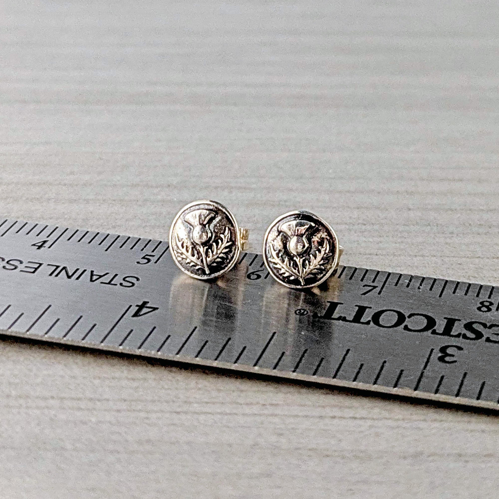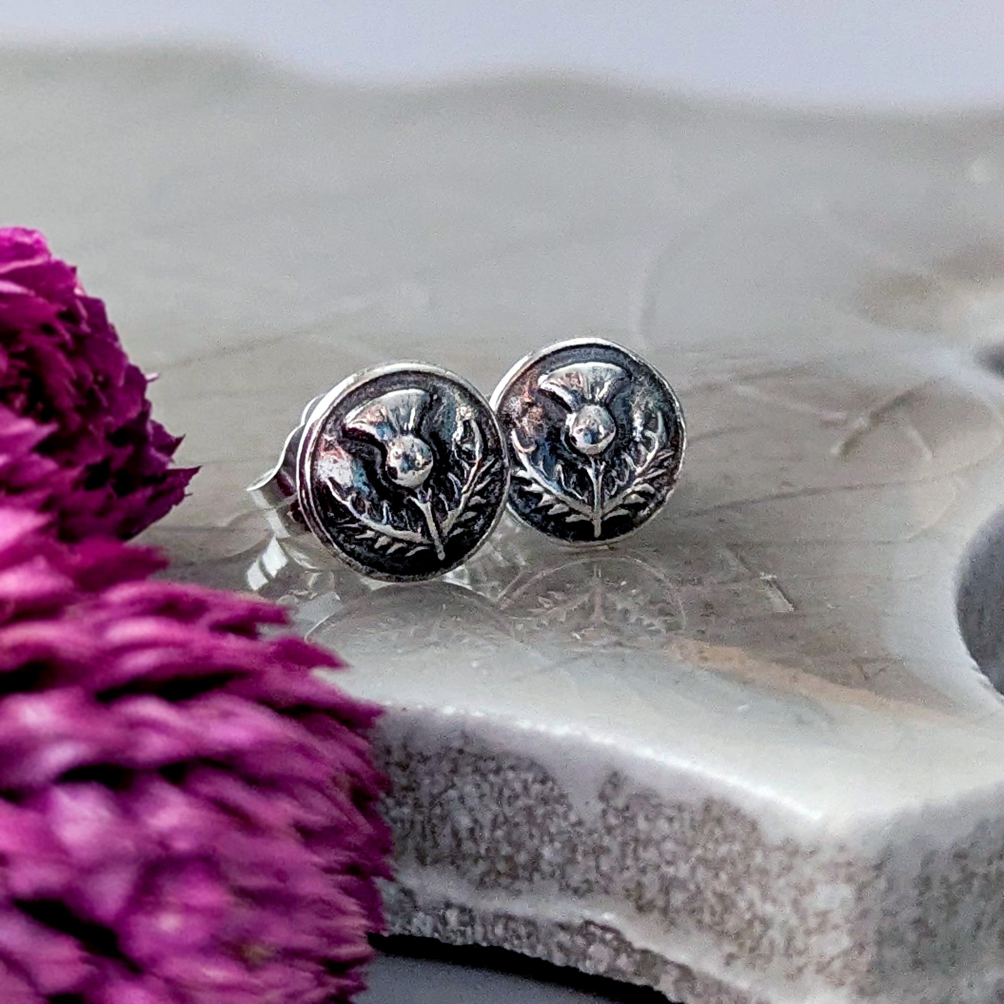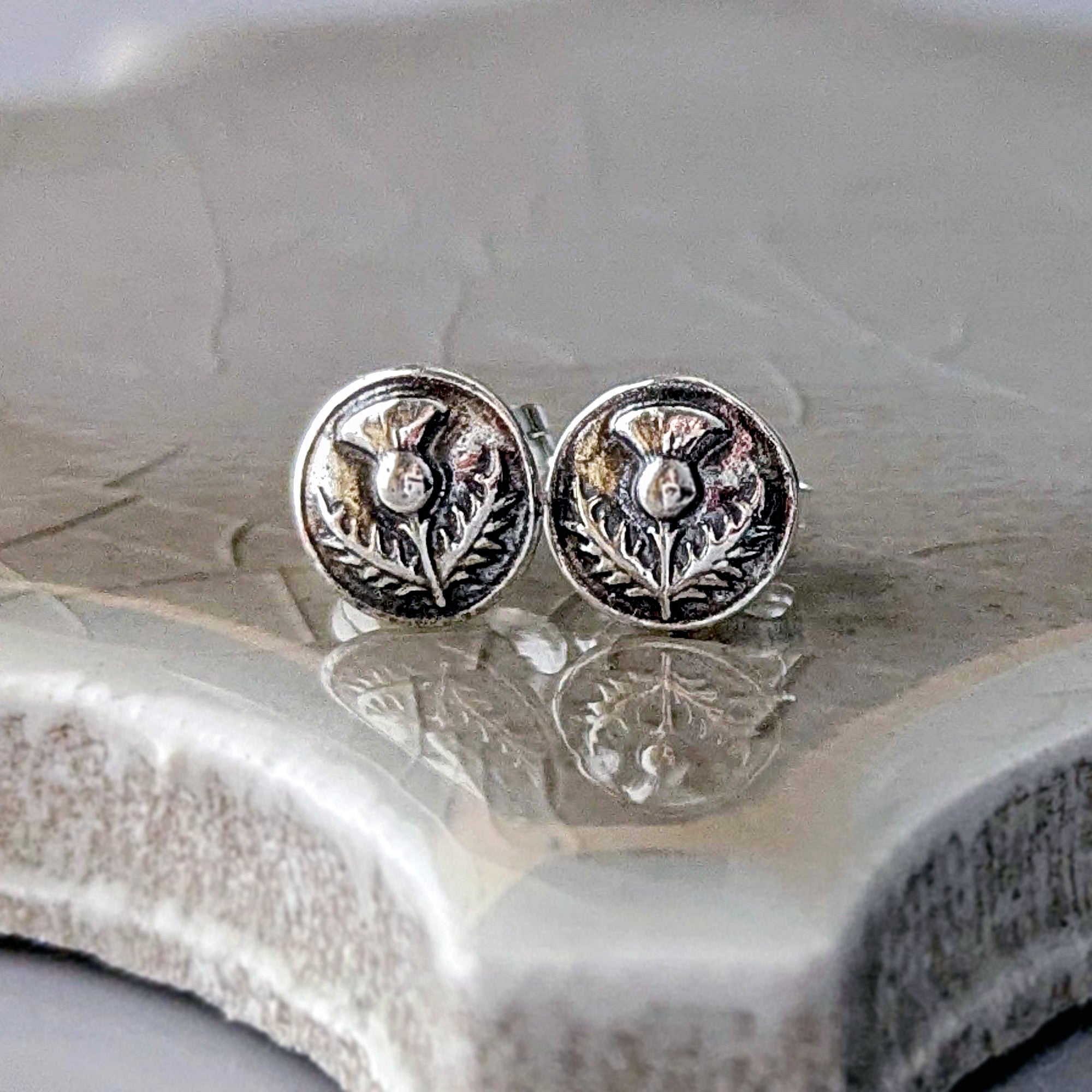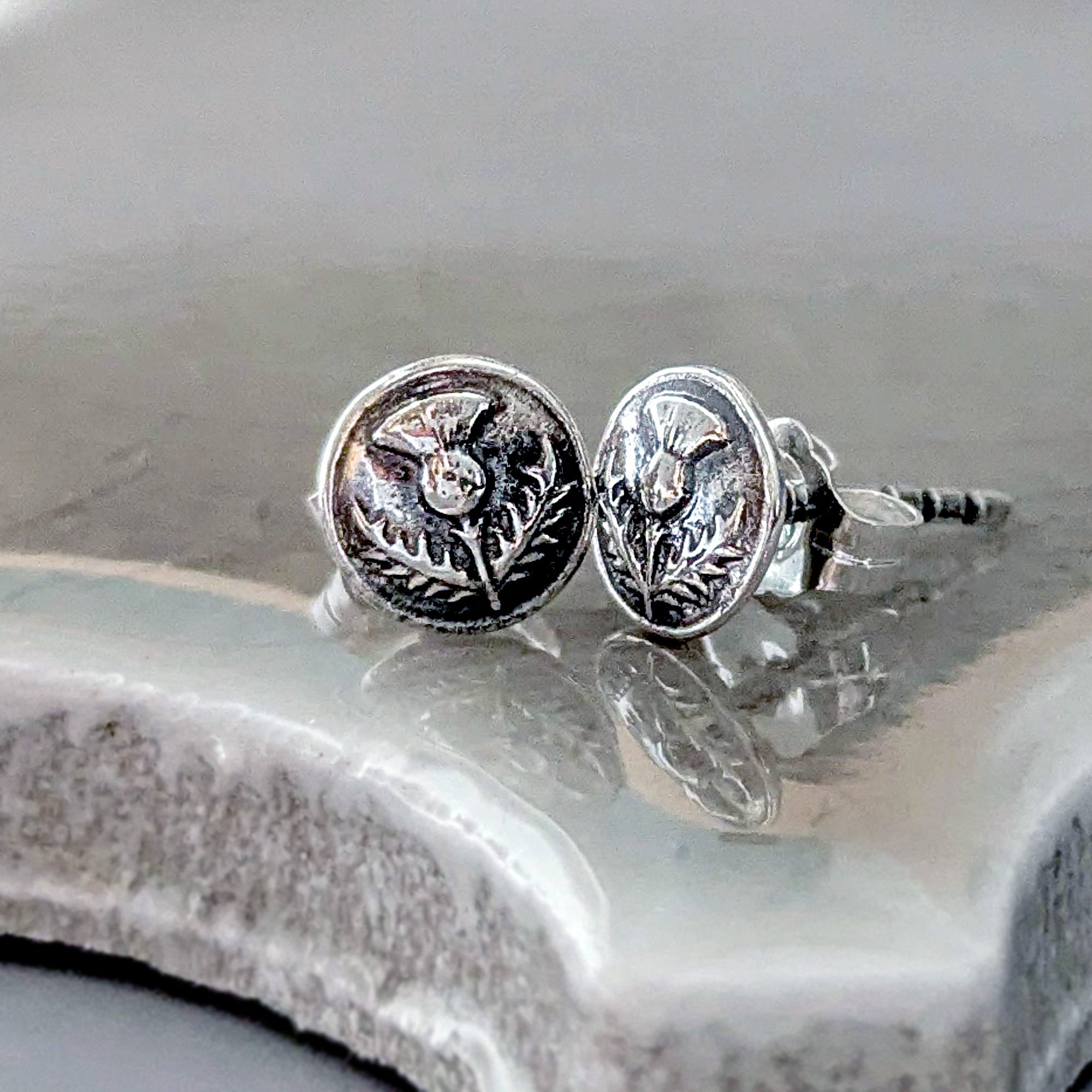 I made these dainty stud earrings, featuring a beautifully detailed tiny thistle flower, with sterling silver metal clay that once fired is transformed into solid sterling silver. After firing the sterling silver posts are soldered onto the backs and the silver is burnished for several hours then oxidized, buffed to bring out detail, burnished again and then hand polished.