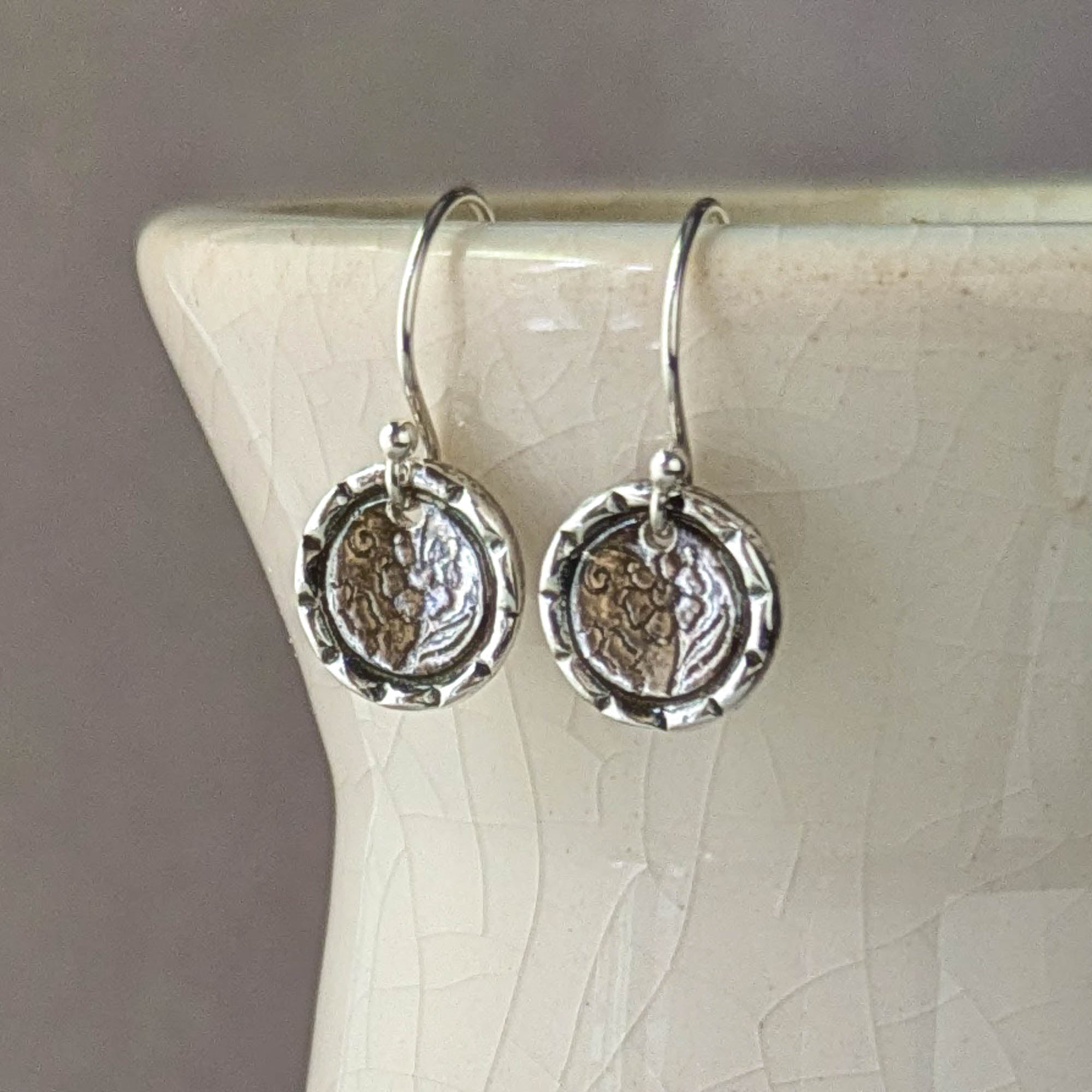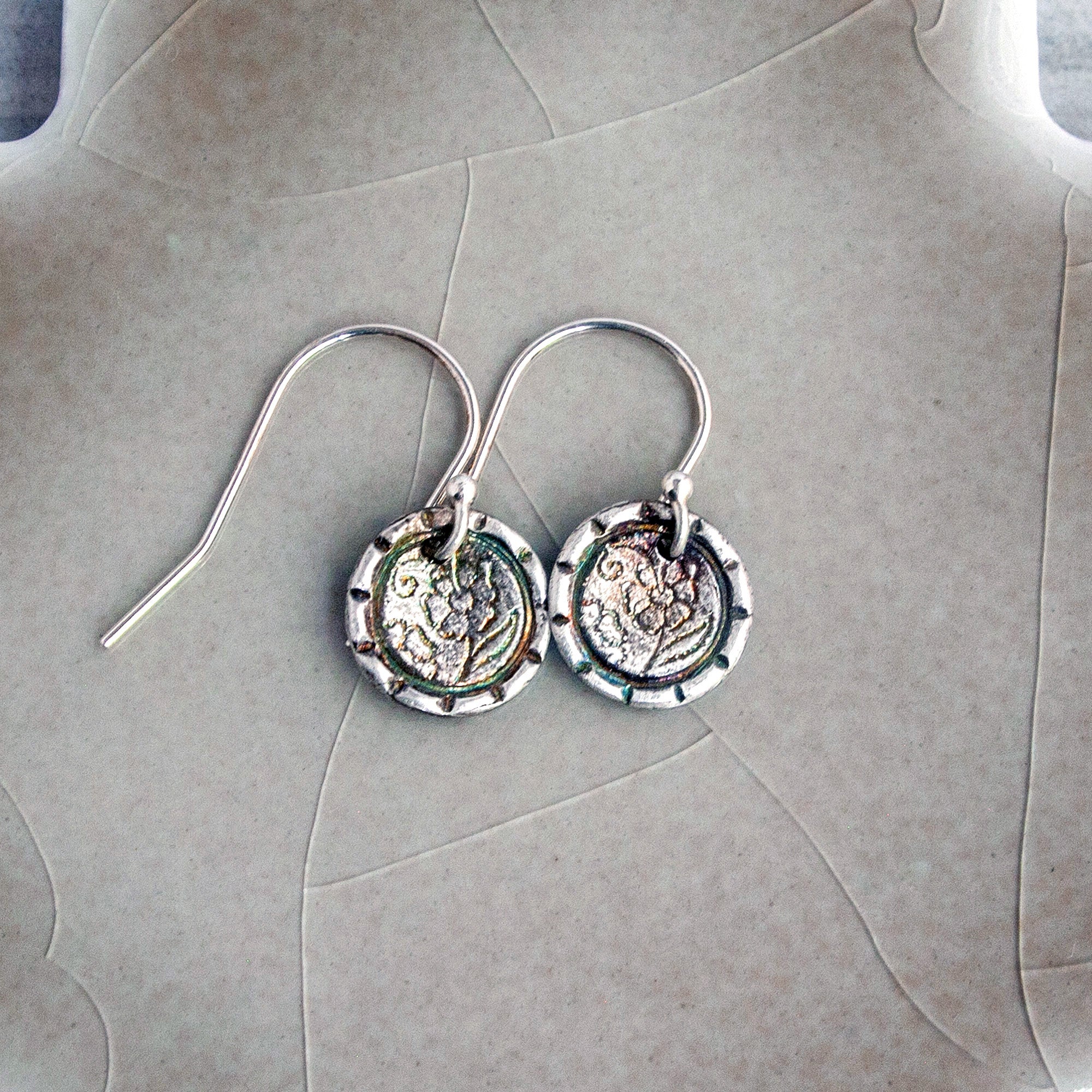 I made these tiny flower earrings in recycled sterling silver from a mold I made of an antique button. The earrings feature a subtle etching of a daisy that appears as though it was lifted from a light sketch dreamily made in a garden.