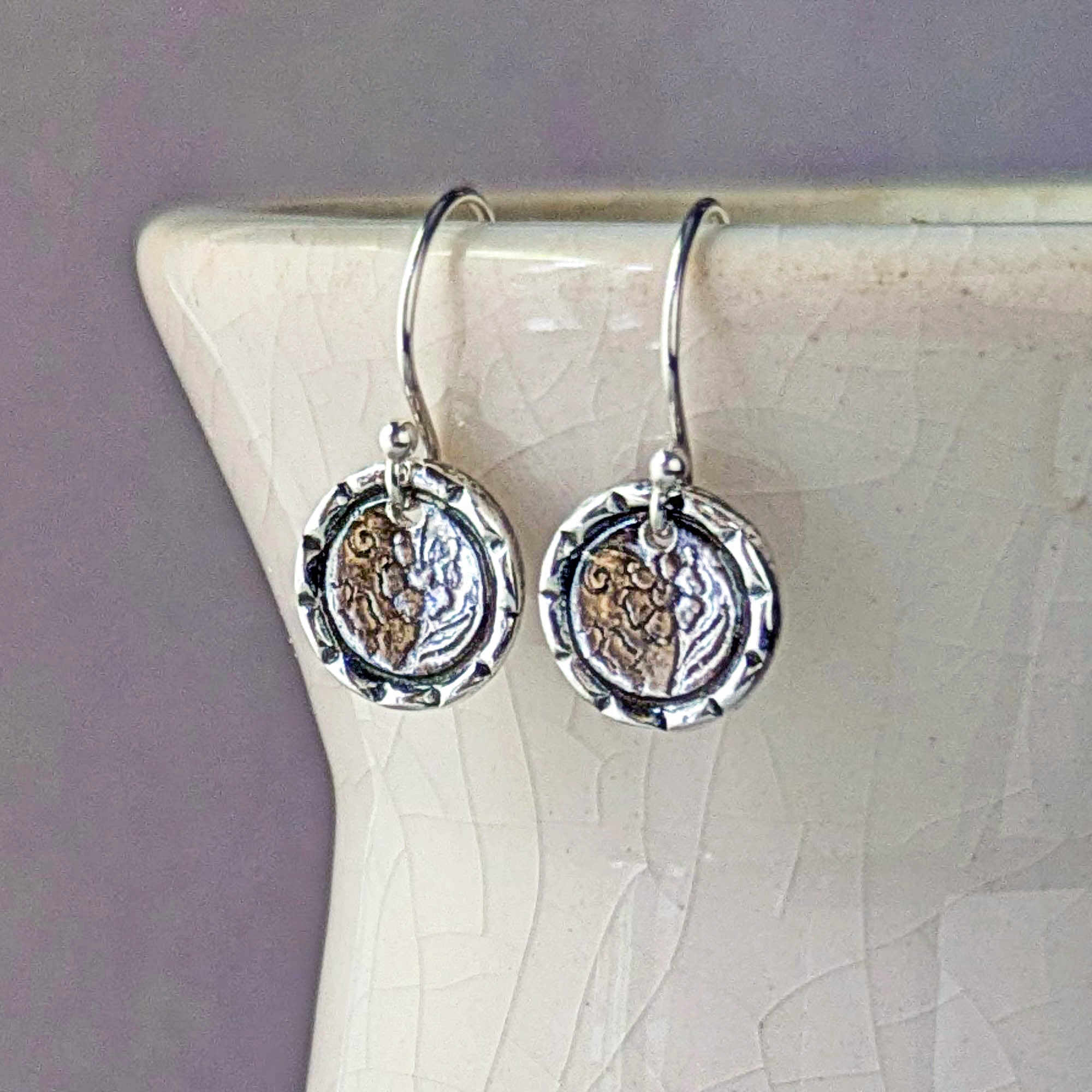 The earrings are cast in sterling silver clay that once fired in my kiln is transformed into solid sterling silver. After firing the earrings are burnished for several hours, oxidized and then buffed to reveal details through contrast, and burnished again for several hours.
