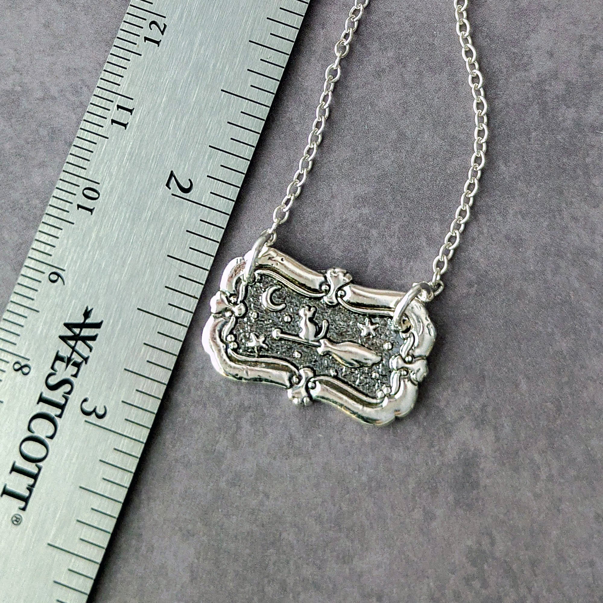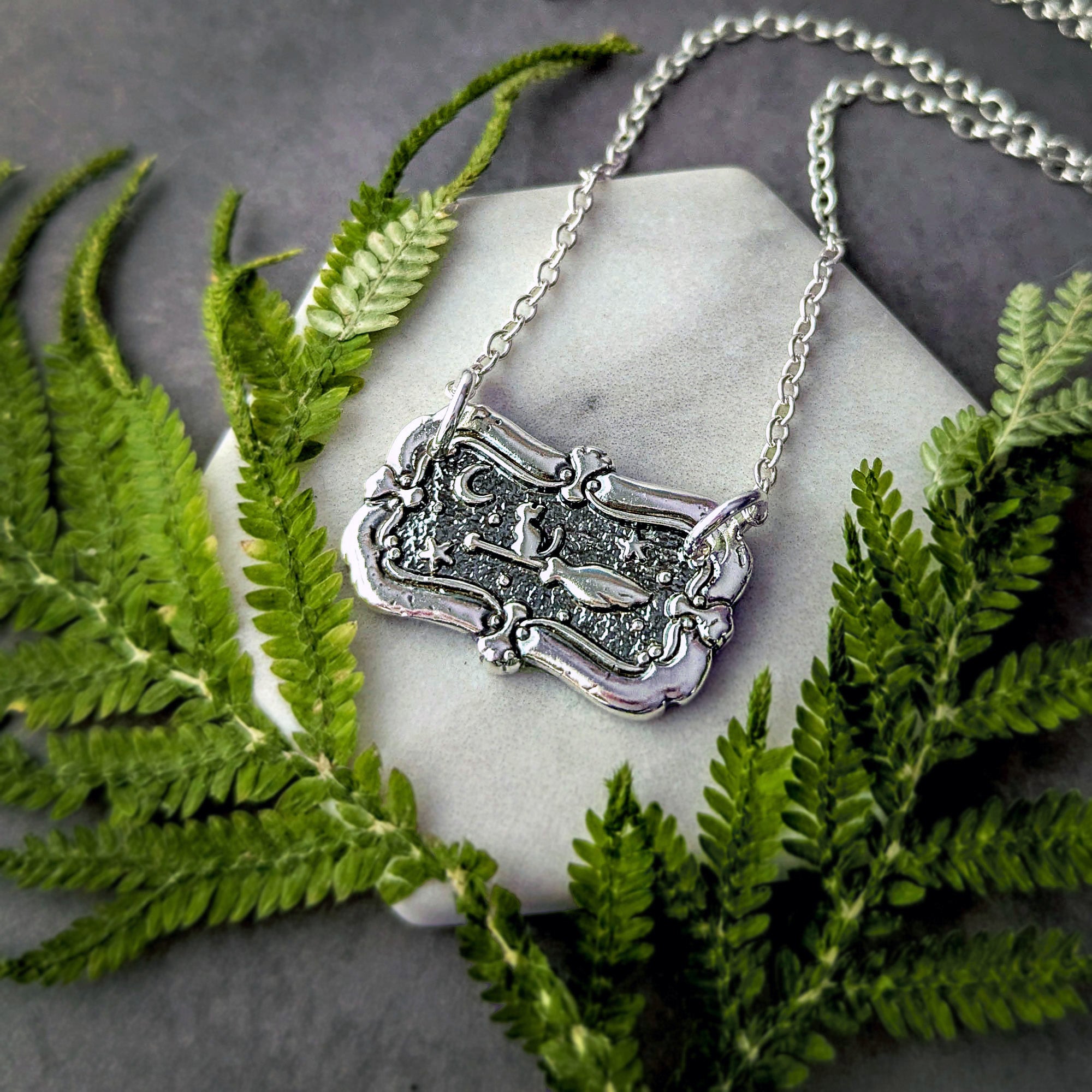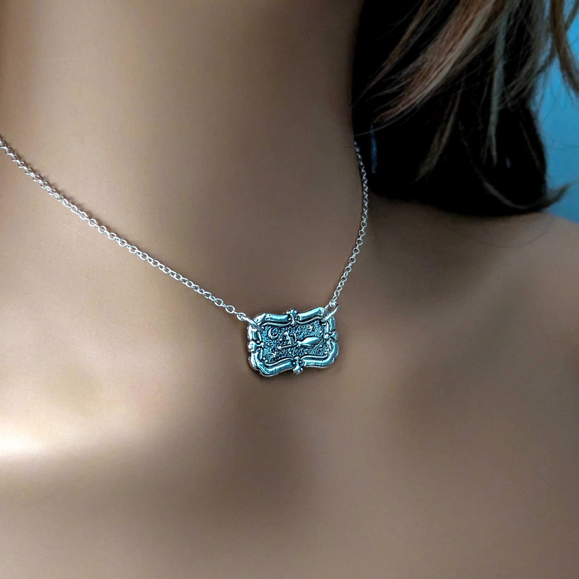 Each pendant is sculpted by hand in recycled silver metal clay, then kiln-fired, polished, and oxidized to bring out every detail — from the shimmer of the broom to the curve of the crescent moon.