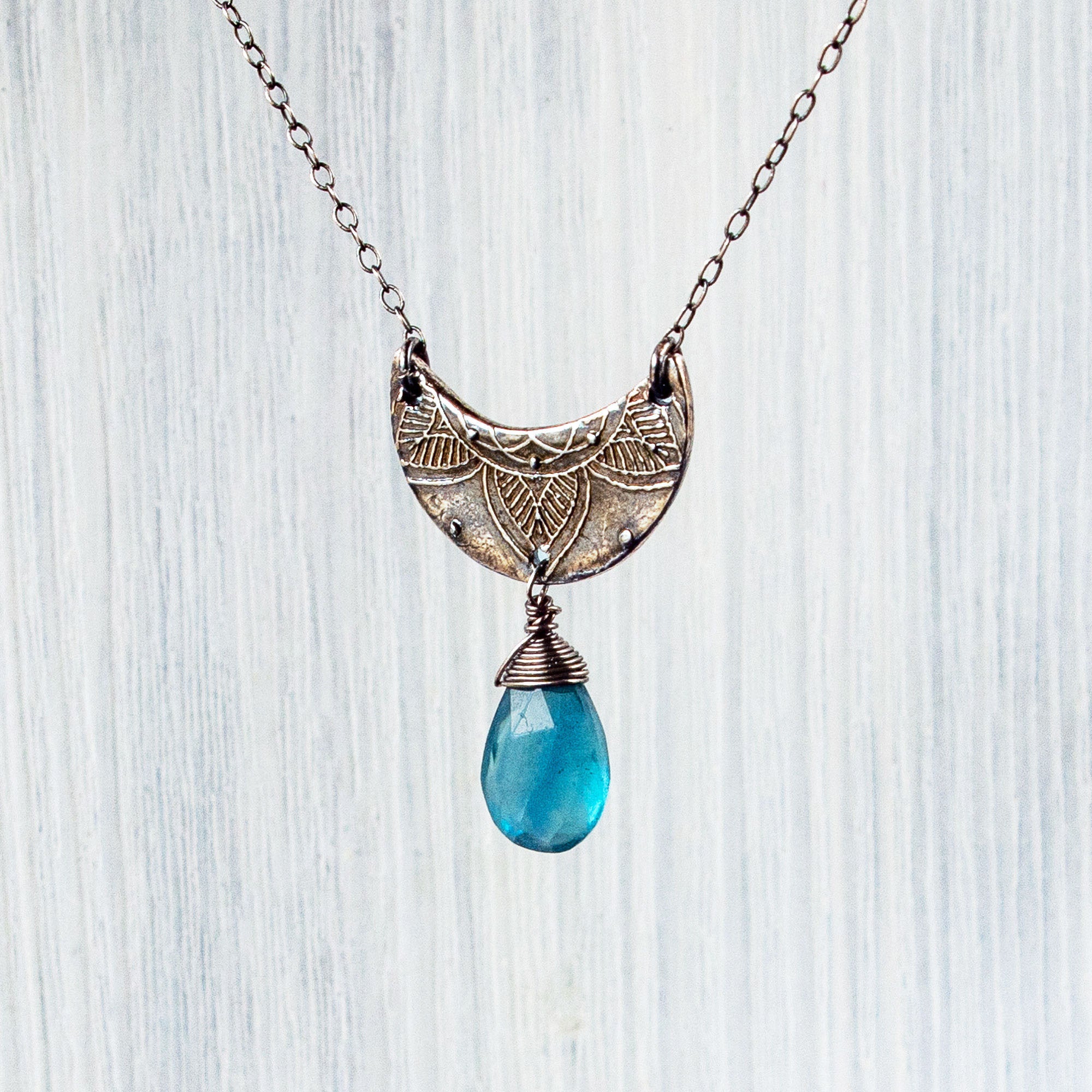 After finishing the crescent moon component I assembled the necklace by adding the antique faceted gemstone accent, a dreamy Paraiba shade of blue fluorite, that I hand wrapped in oxidized sterling silver wire, and added oxidized sterling silver oval rolo chain, and lobster clasp. The finishing touch: an elegant textured sterling silver extender chain allows the necklace to be worn at up to nearly 19 inches long and it is finished with a Balinese sterling silver charm.