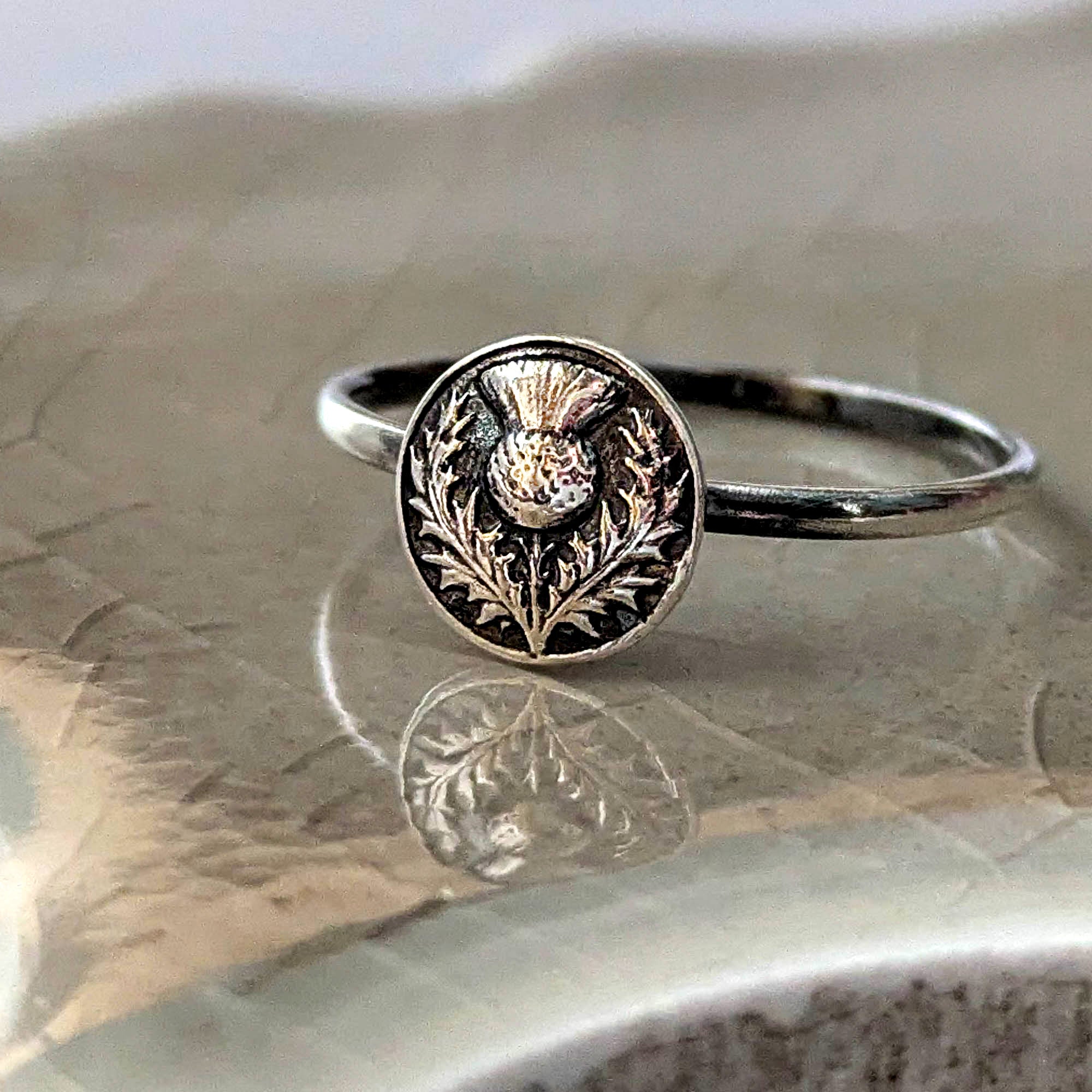 I made this ring, featuring the thistle flower in all it's glory, with silver metal clay that once fired is transformed into solid sterling silver. After firing the silver is burnished for several hours then oxidized, buffed to bring out detail, burnished again and then hand polished.