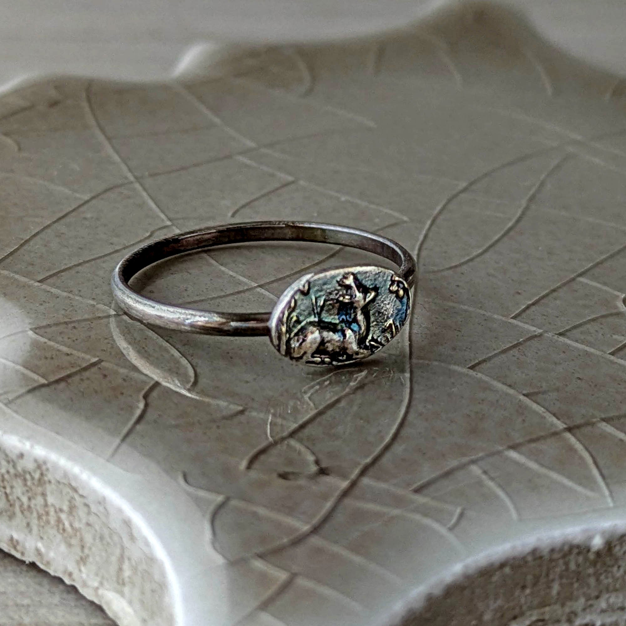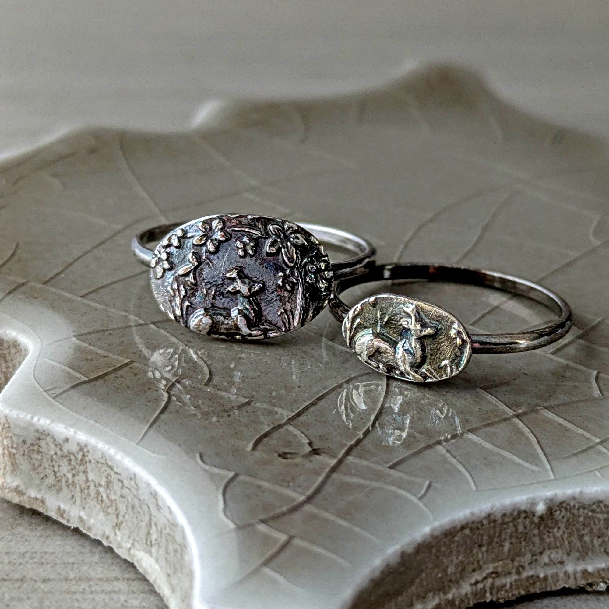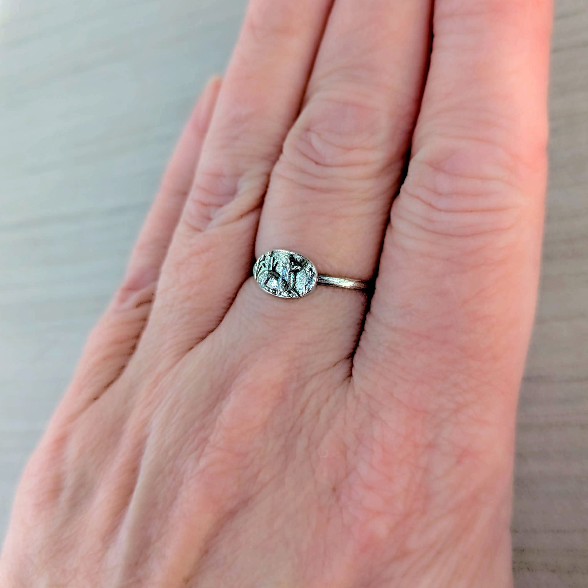 Please note: your ring will be individually custom made, due to the medium and techniques I work in there will be subtle variations in size of ornament and depth and tint of oxidized finish.