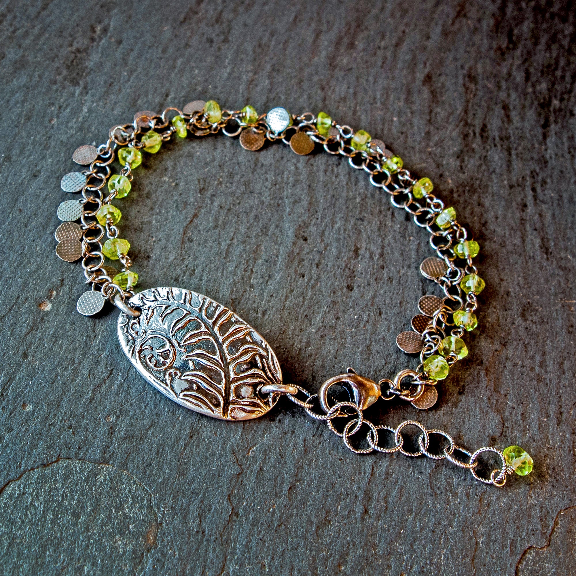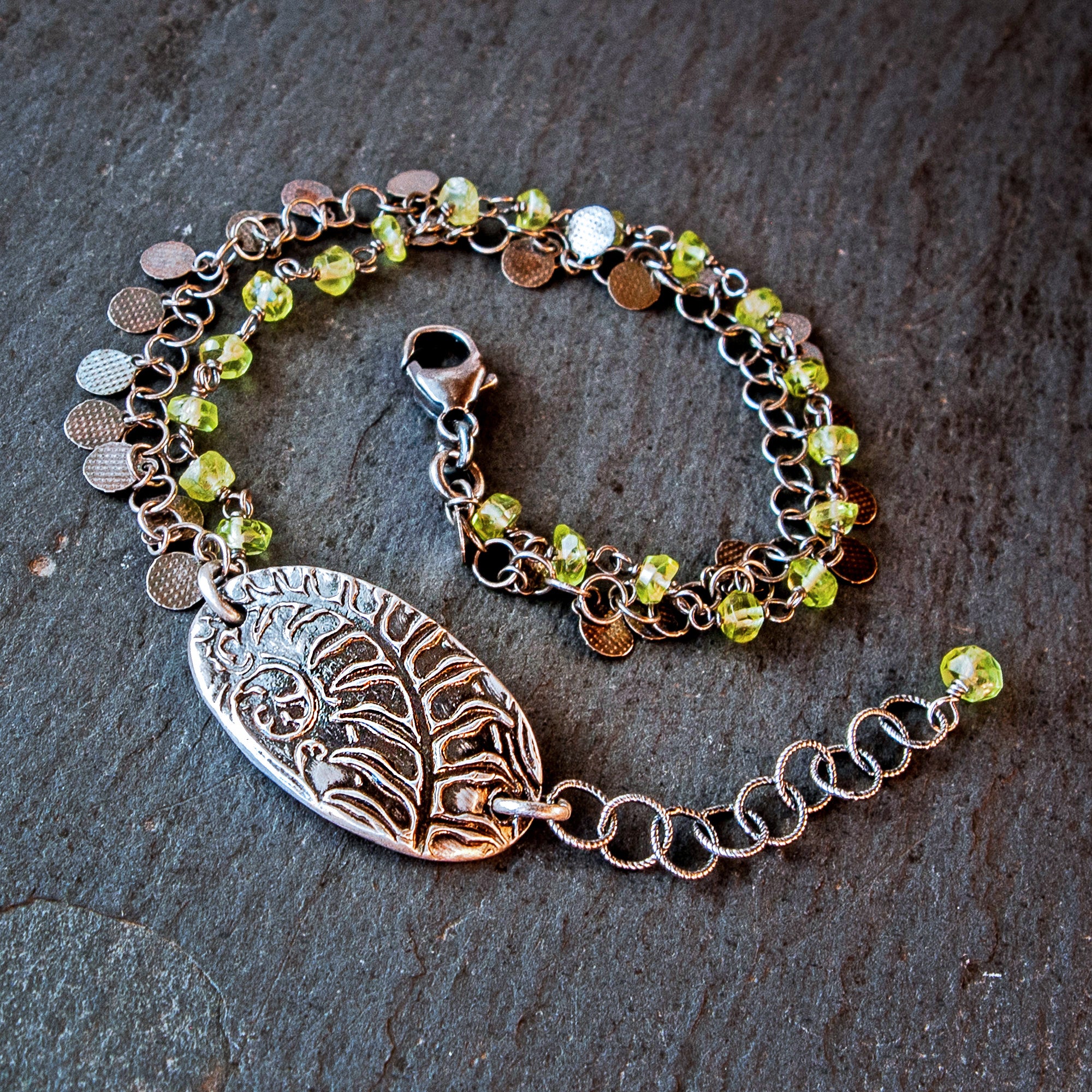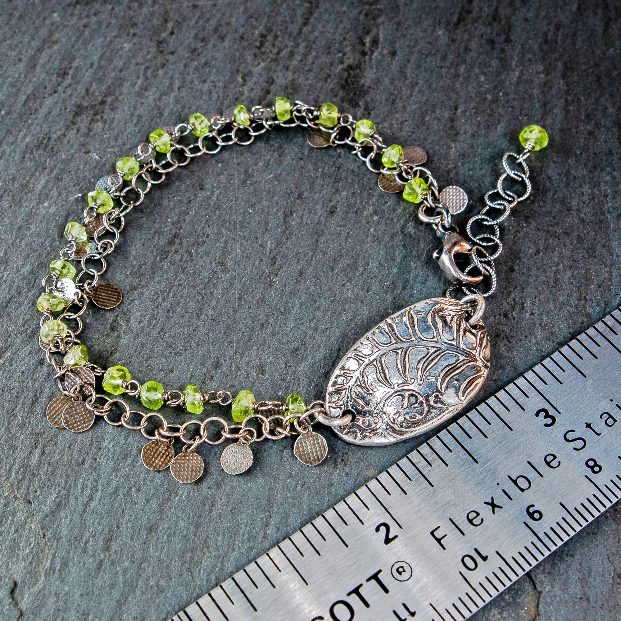 Secured with a sterling silver lobster clasp and featuring a patterned extender chain with a tiny dangling peridot, this bracelet ensures a perfect fit for every wrist, completing the magical journey into the heart of the enchanted forest.