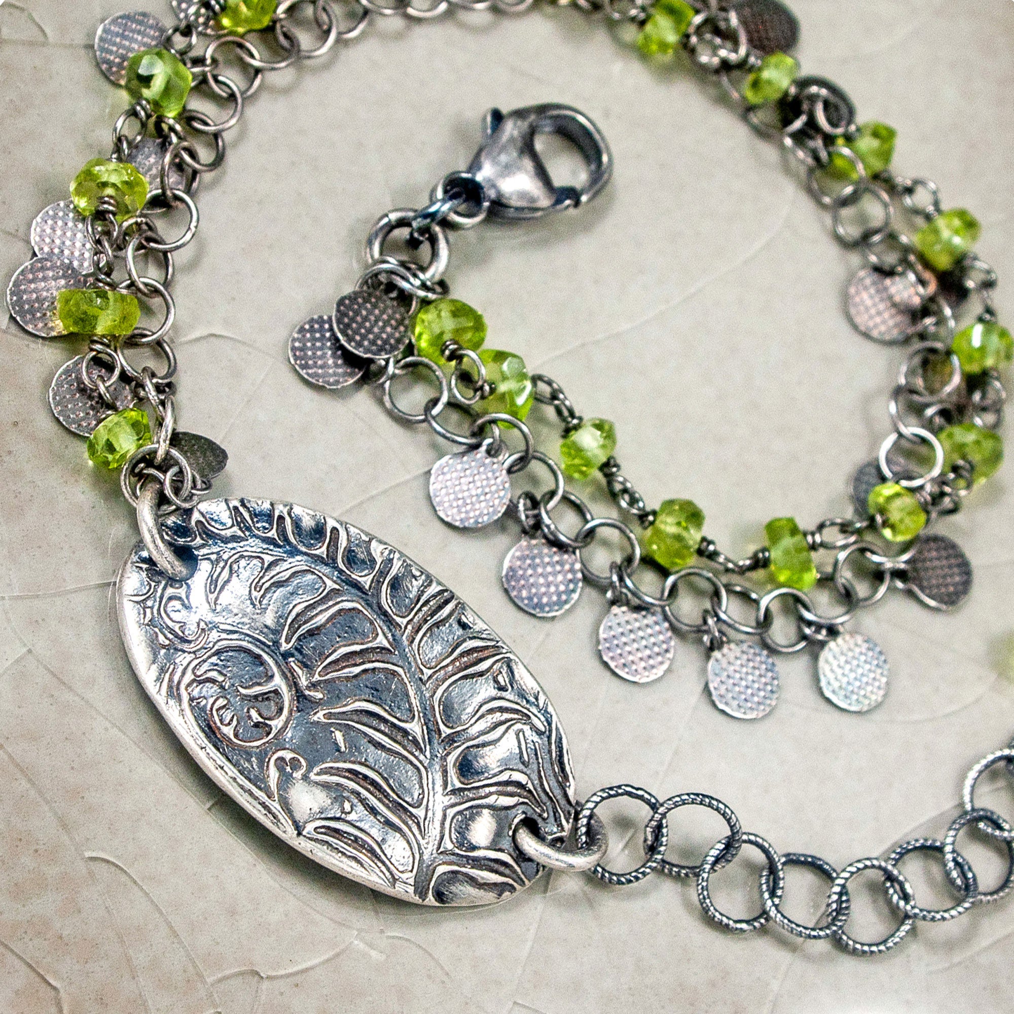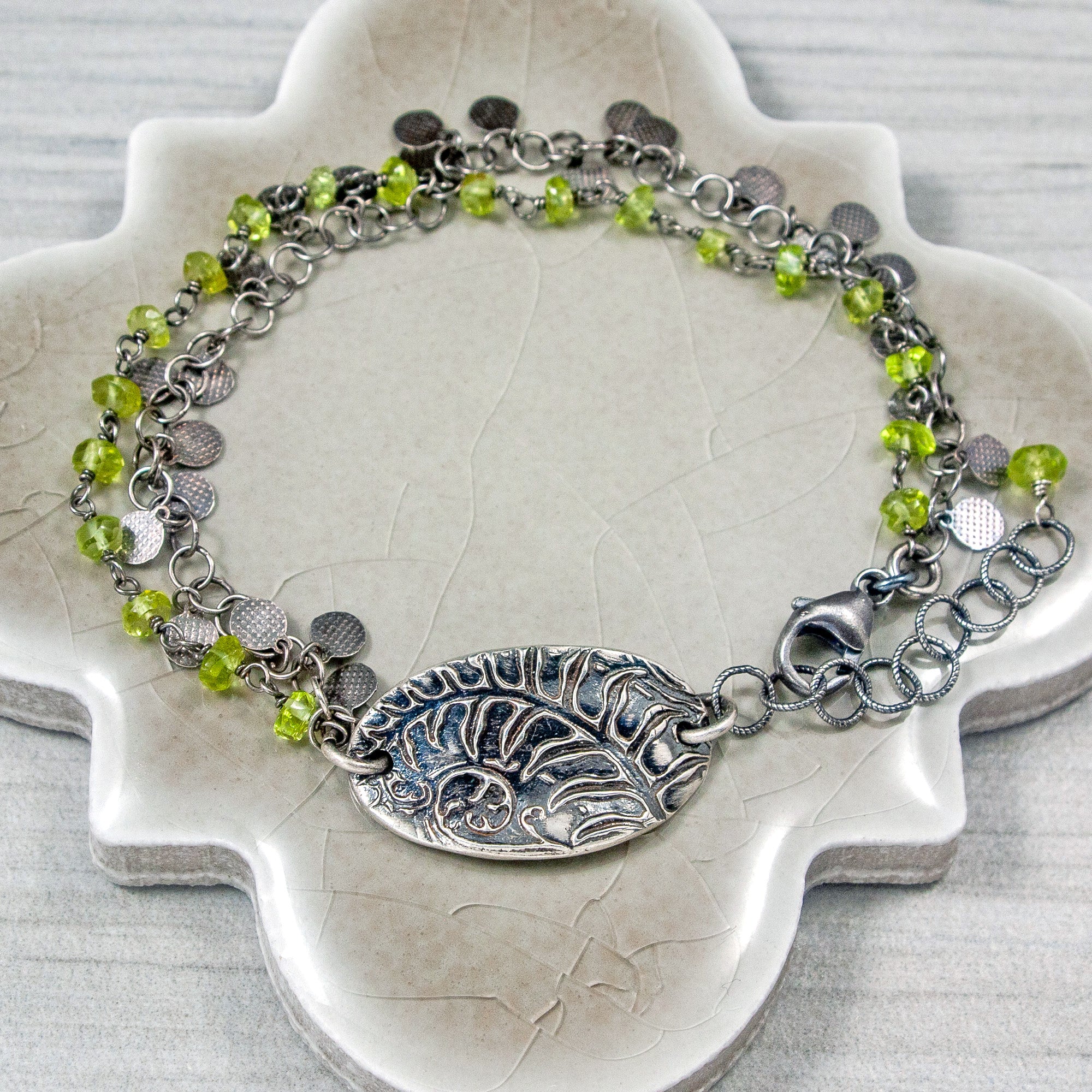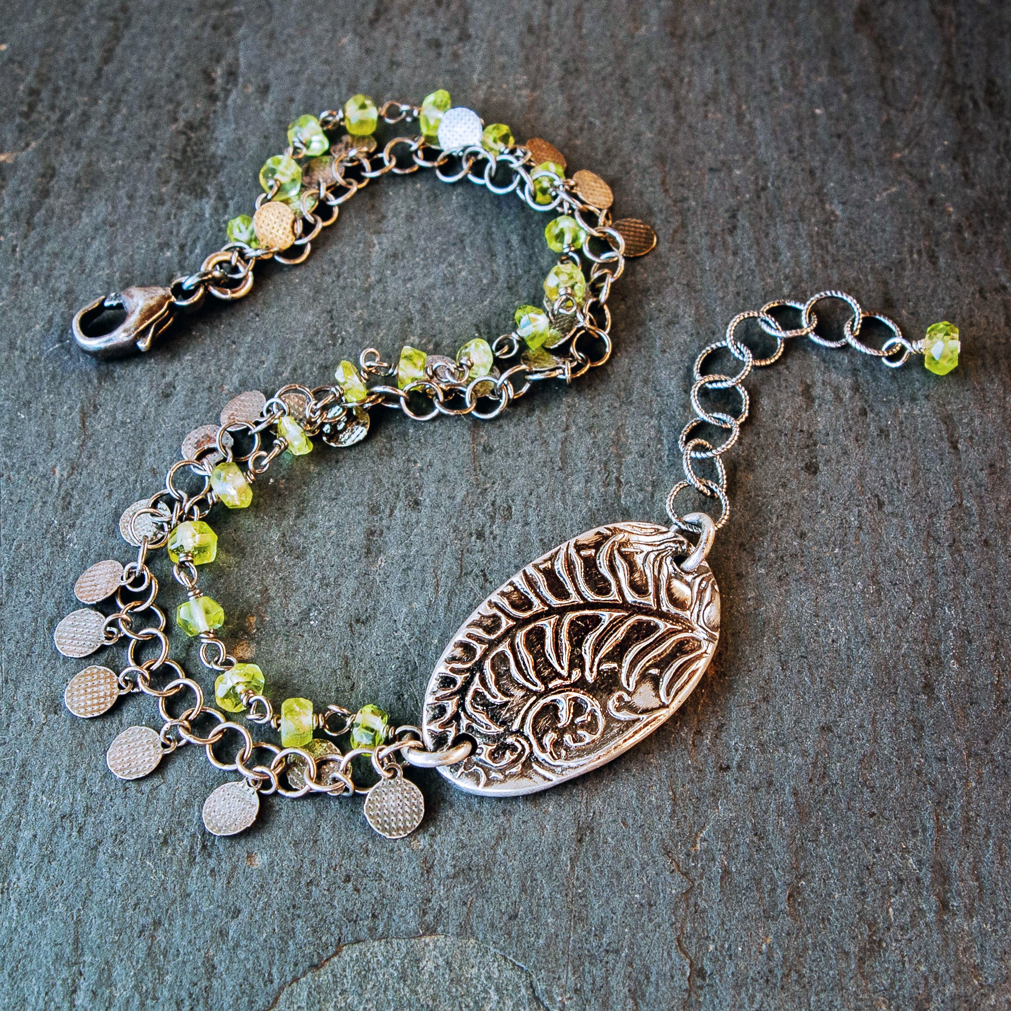 Secured with a sterling silver lobster clasp and featuring a patterned extender chain with a tiny dangling peridot, this bracelet ensures a perfect fit for every wrist, completing the magical journey into the heart of the enchanted forest.