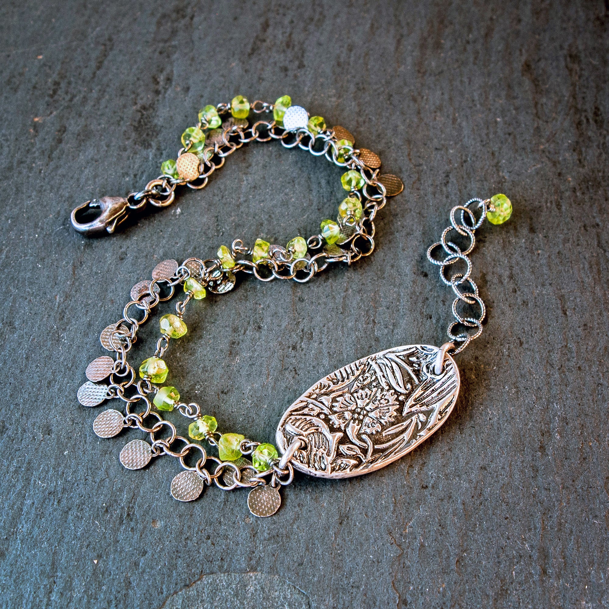Embellished with an antiqued silver chain, delicate circular charms dance playfully, mirroring the dappled sunlight filtering through the leaves. Accompanying this is another chain adorned with wire-wrapped faceted peridot rondelles, adding a touch of woodland magic and a pop of vibrant green.